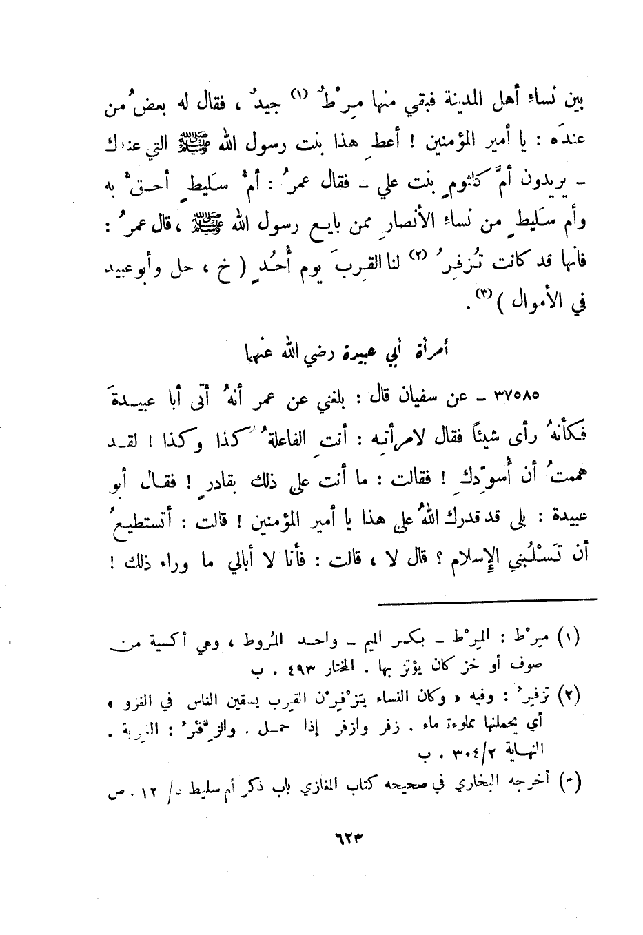 37588- عن سفيان قال: بلغني عن عمر أنه أتى أبا عبيدة فكأنه رأى شيئا فقال لامرأته: أنت الفاعلة كذا وكذا! لقد هممت أن أسودك! فقالت: ما أنت على ذلك بقادر! فقال أبو عبيدة: بلى قد قدرك الله على هذا يا أمير المؤمنين! قالت: أتستطيع أن تسلبني الإسلام؟ قال لا، قالت: فأنا لا أبالي ما وراء ذلك!