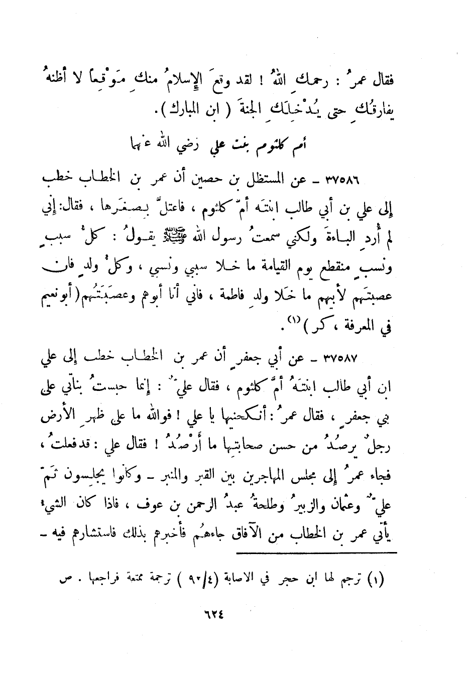 37589- عن المستظل بن حصين أن عمر بن الخطاب خطب إلى علي بن أبي طالب ابنته أم كلثوم، فاعتل بصغرها، فقال: إني لم أرد الباءة ولكني سمعت رسول الله صلى الله عليه وسلم يقول: كل سبب ونسب منقطع يوم القيامة ما خلا سببي ونسبي، وكل ولد فإن عصبتهم لأبيهم ما خلا ولد فاطمة، فإني أنا أبوهم وعصبتهم. "أبو نعيم في المعرفة، كر"1