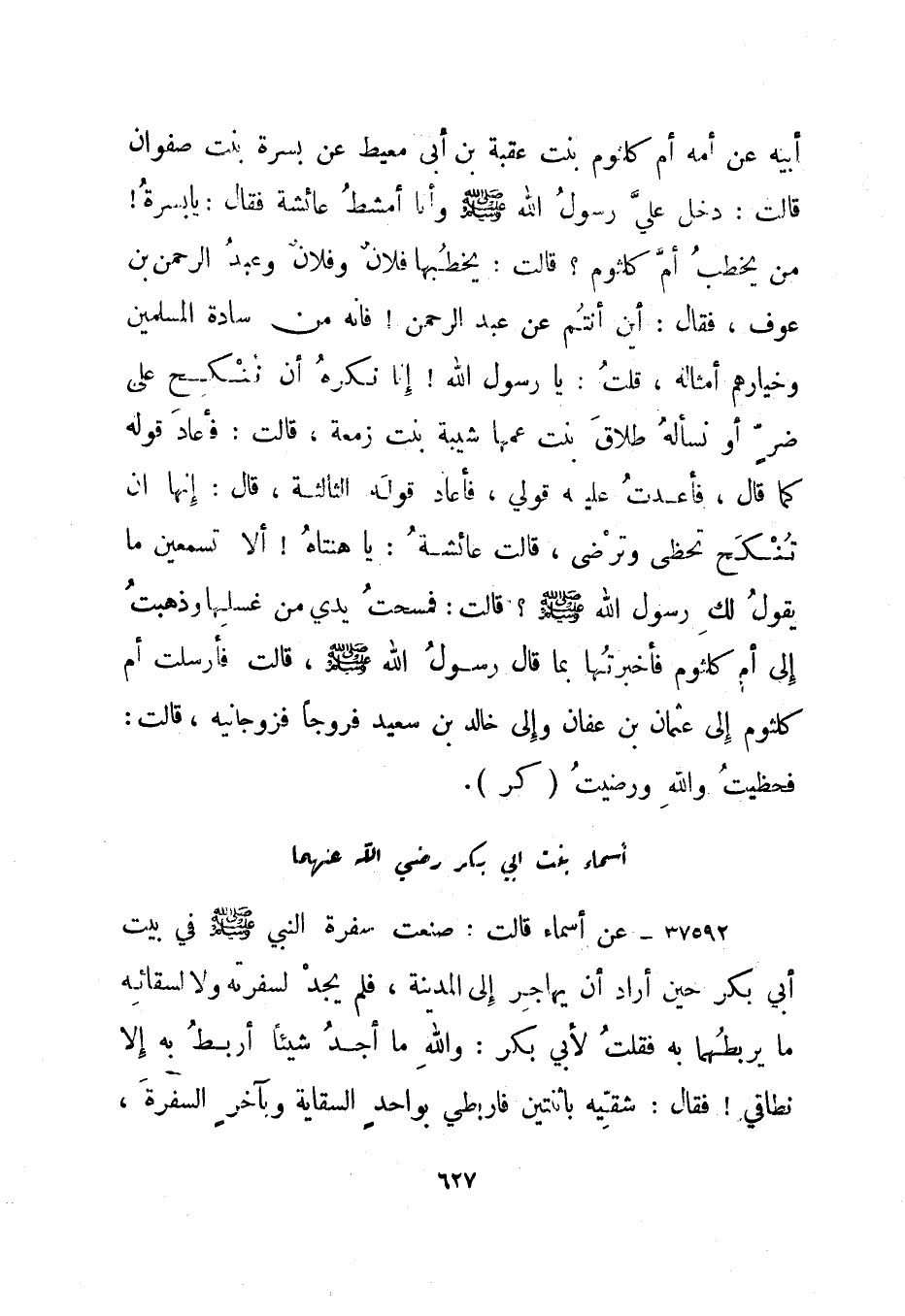 37595- عن أسماء قالت: صنعت صفرة النبي صلى الله عليه وسلم في بيت أبي بكر حين أراد أن يهاجر إلى المدينة، فلم يجد لسفرته ولا لسقائه ما يربطهما به فقلت لأبي بكر: والله ما أجد شيئا أربط به إلا نطاقي! فقال: شقيه باثنتين فاربطي بواحد السقاية وبآخر السفرة،