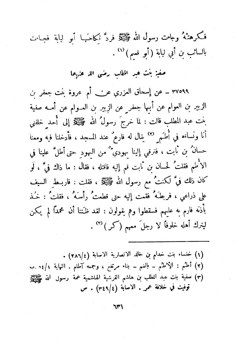 37602- عن إسحاق العزري عن أم عروة بنت جعفر بن الزبير بن العوام عن أبيها جعفر عن الزبير بن العوام عن أمه صفية بنت عبد المطلب قالت: لما خرج رسول الله صلى الله عليه وسلم إلى أحد خلفني أنا ونساءه في أطم2 يقال له فارع عند المسجد، فأدخلنا فيه ومعنا حسان بن ثابت، فترقي إلينا يهودي من اليهود حتى أطل علينا في الأطم فقلت لحسان بن ثابت قم إليه فاقتله، فقال: ماذاك في، لو كان ذلك في لكنت مع رسول الله صلى الله عليه وسلم، فقلت: فاربط السيف على ذراعي، فربطه فقمت إليه حتى قطعت رأسه، فقلت: خذ بأذنه فارم به عليهم فسقطوا وهم يقولون: لقد ظننا أن محمدا لم يكن ليترك أهله خلوفا لا رجل معهم. "كر"3
