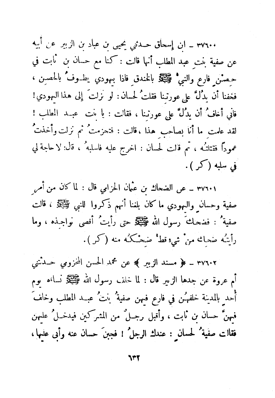 37603- ابن إسحاق حدثني يحيى بن عباد بن الزبير عن أبيه عن صفية بنت عبد المطلب أنها قالت: كنا مع حسان بن ثابت في حصن فارع والنبي صلى الله عليه وسلم بالخندق فإذا بيهودي يطوف بالحصن، فخفنا أن يدل على عورتنا فقلت لحسان: لو نزلت إلى هذا اليهودي! فإني أخاف أن يدل على عورتنا، فقالت: يا بنت عبد المطلب! لقد علمت ما أنا بصاحب هذا، قالت: فتحزمت ثم نزلت وأخذت عمودا فقتلته، ثم قالت لحسان: اخرج عليه فاسلبه، قال: لا حاجة لي في سلبه. "كر".