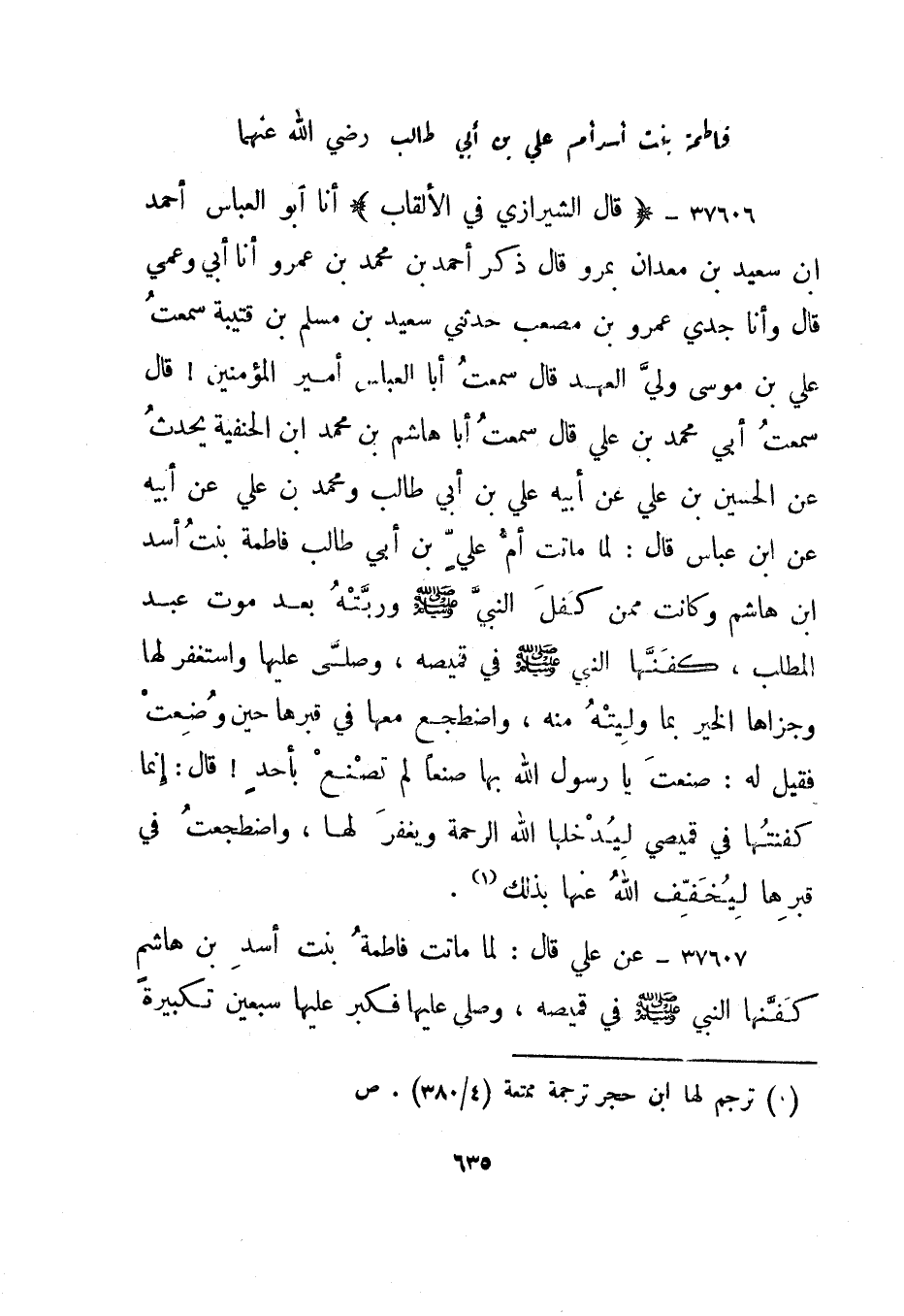 37609- "قال الشيرازي في الألقاب" أنا أبو العباس أحمد بن سعيد بن معدان بمرو قال ذكر أحمد بن محمد بن عمرو أنا أبي وعمي قال وأنا جدي عمرو بن مصعب حدثني سعيد بن مسلم بن قتيبة سمعت علي بن موسى ولي العهد قال سمعت أبا العباس أمير المؤمنين! قال سمعت أبي محمد بن علي قال سمعت أبا هاشم بن محمد بن الحنفية يحدث عن الحسين ابن علي عن أبيه علي بن أبي طالب ومحمد بن علي عن أبيه عن ابن عباس قال: لما ماتت أم علي بن أبي طالب فاطمة بنت أسد بن هاشم وكانت ممن كفل النبي صلى الله عليه وسلم وربته بعد موت عبد المطلب، كفنها النبي صلى الله عليه وسلم في قميصه، وصلى عليها واستغفر لها وجزاها الخير بما وليته منه، واضطجع معها في قبرها حين وضعت فقيل له: صنعت يا رسول الله بها صنعا لم تصنع بأحد! قال: إنما كفنتها في قميصي ليدخلها الله الرحمة ويغفر لها، واضطجعت في قبرها ليخفف الله عنها بذلك1