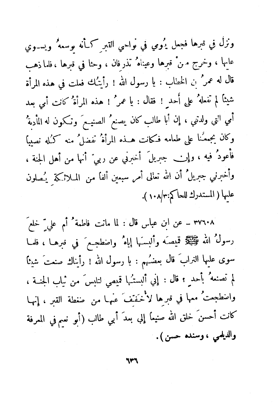 37611- عن ابن عباس قال: لما ماتت فاطمة أم علي خلع رسول الله صلى الله عليه وسلم قميصه وألبسها إياه واضطجع في قبرها، فلما سوى عليها التراب قال بعضهم: يا رسول الله! رأيناك صنعت شيئا لم تصنعه بأحد؟ قال: إني ألبستها قميصي لتلبس من ثياب الجنة، واضطجعت معها في قبرها لأخفف عنها من ضغطة القبر، إنها كانت أحسن خلق الله صنيعا إلى بعد أبي طالب. "أبو نعيم في المعرفة والديلمي، وسنده حسن".