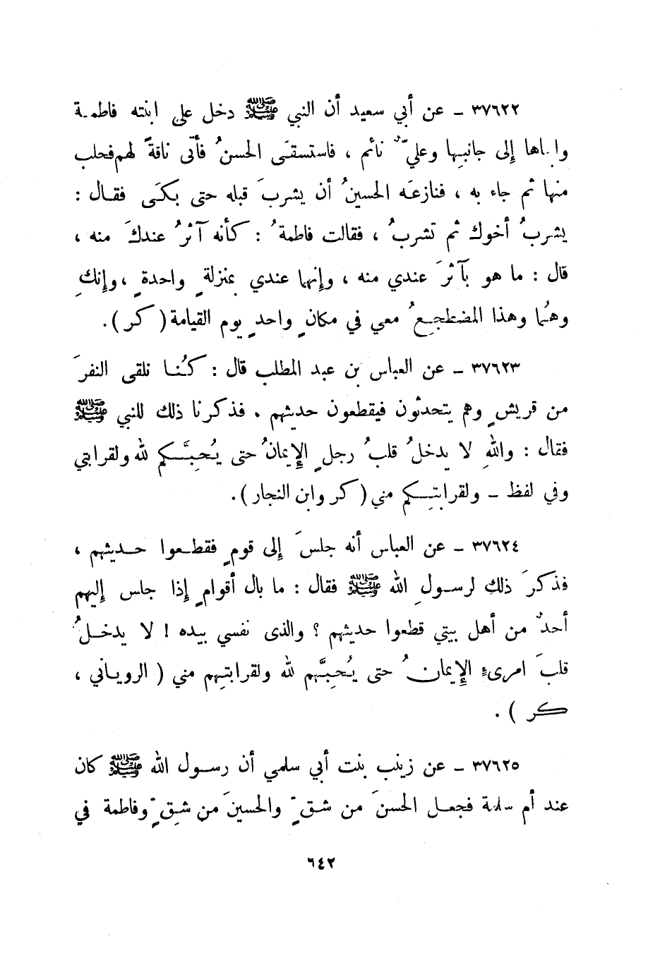 37626- عن العباس بن عبد المطلب قال: كنا نلقى النفر من قريش وهم يتحدثون فيقطعون حديثهم، فذكرنا ذلك للنبي صلى الله عليه وسلم فقال: والله لا يدخل قلب رجل الإيمان حتى يحبكم لله ولقرابتي وفي لفظ - ولقرابتكم مني. "كر وابن النجار".