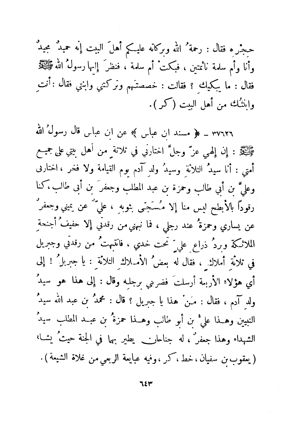 37629- "مسند ابن عباس" عن ابن عباس قال رسول الله صلى الله عليه وسلم: إن إلهي عز وجل اختارني في ثلاثة من أهل بيتي على جميع أمتي: أنا سيد الثلاثة وسيد ولد آدم يوم القيامة ولا فخر، اختارني وعلي بن أبي طالب وحمزة بن عبد المطلب وجعفر بن أبي طالب، كنا رقودا بالأبطح ليس منا إلا مسجى بثوبه، علي عن يميني وجعفر عن يساري وحمزة عند رجلي، فما نبهني من رقدتي إلا حفيف أجنحة الملائكة وبرد ذراع علي تحت خدي، فانتبهت من رقدتي وجبريل في ثلاثة أملاك، فقال له بعض الأملاك الثلاثة: يا جبريل! إلى أي هؤلاء الأربعة أرسلت فضربني برجله وقال: إلى هذا هو سيد ولد آدم، فقال: من هذا يا جبريل؟ قال: محمد بن عبد الله سيد النبيين وهذا علي بن أبو طالب وهذا حمزة بن عبد المطلب سيد الشهداء وهذا جعفر، له جناحان يطير بهما في الجنة حيث يشاء. "يعقوب بن سفيان، "خط، كر"، وفيه عبايعة الربعي من غلاة الشيعة".
