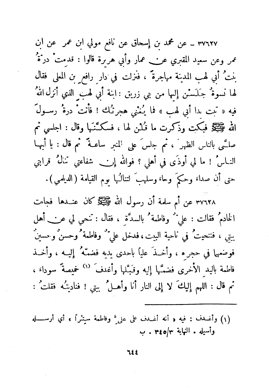 37630- عن محمد بن إسحاق عن نافع مولى ابن عمر عن ابن عمر وعن سعيد المقبري عن عمار وأبي هريرة قالوا: قدمت درة بنت أبي لهب المدينة مهاجرة، فنزلت في دار رافع بن المعلى فقال لها نسوة جلسن إليها من بني زريق: ابنة أبي لهب الذي أنزل الله فيه "تبت يدا أبي لهب" فما يغني هجرتك! فأتت درة رسول الله صلى الله عليه وسلم فبكت وذكرت ما قلن لها، فسكنها وقال: اجلسي ثم صلى بالناس الظهر، ثم جلس على المنبر ساعة ثم قال: يا أيها الناس! مالي أوذى في أهلي؟ فوالله إن شفاعتي تنال قرابتي حتى أن صداء وحكم وحاء وسلهب لتنالها يوم القيامة. "الديلمي".
