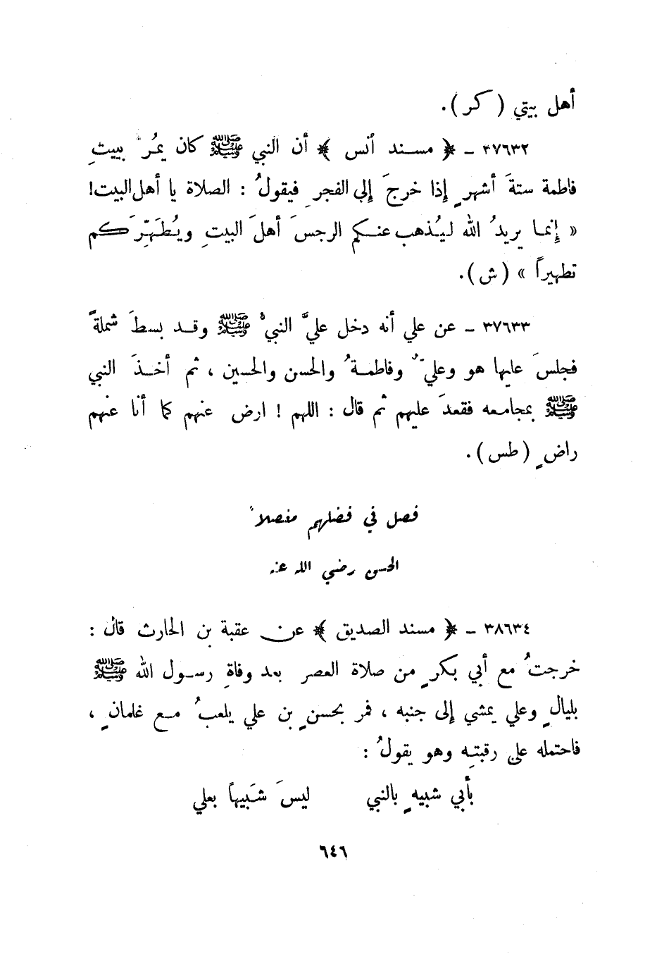 37635- "مسند أنس" أن النبي صلى الله عليه وسلم كان يمر ببيت فاطمة ستة أشهر إذا خرج إلى الفجر فيقول: الصلاة يا أهل البيت! "إنما يريد الله ليذهب عنكم الرجس أهل البيت ويطهركم تطهيرا". "ش".