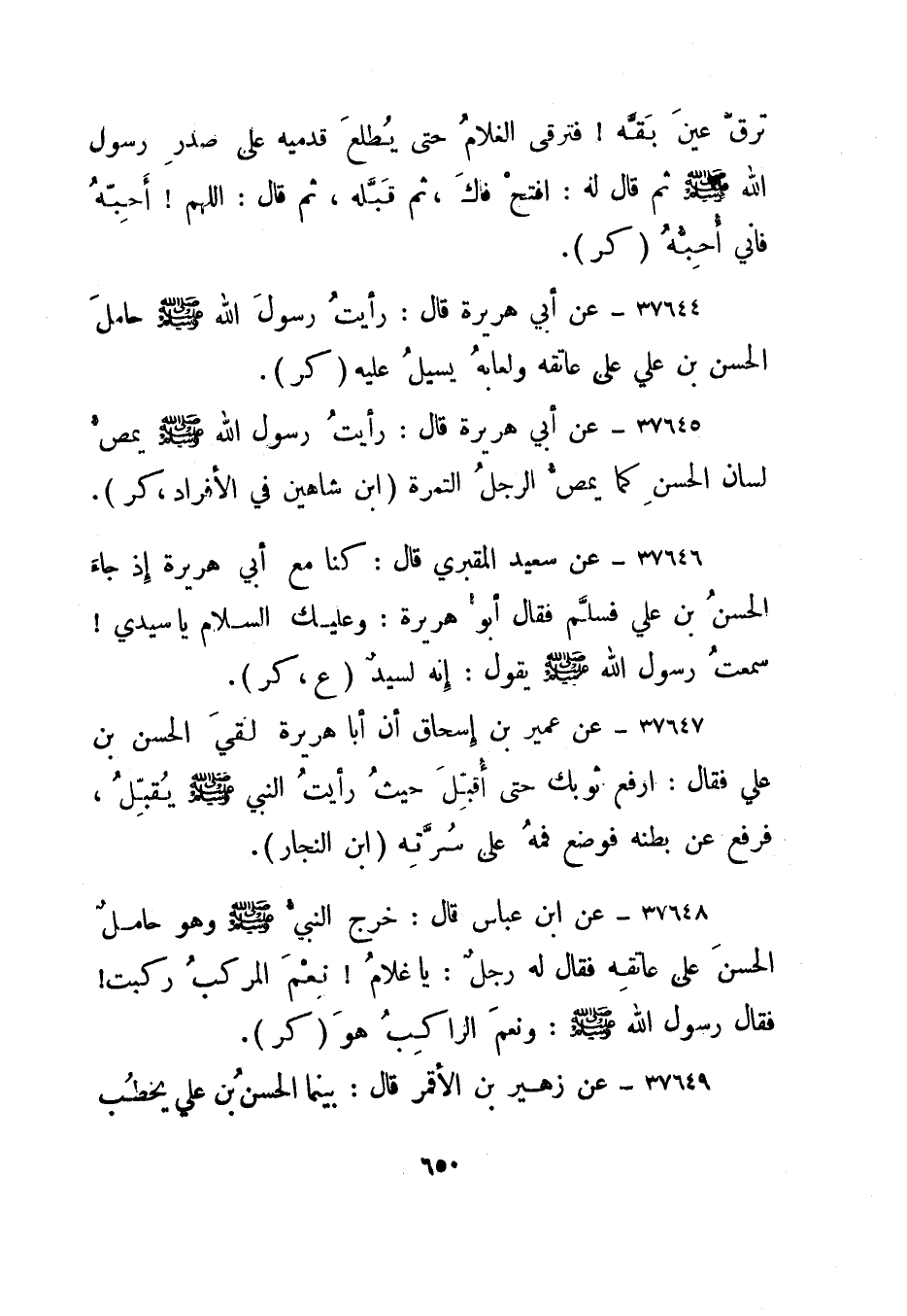 37649- عن سعيد المقبري قال: كنا مع أبي هريرة إذ جاء الحسن بن علي فسلم فقال أبو هريرة: وعليك السلام يا سيدي! سمعت رسول الله صلى الله عليه وسلم يقول: إنه لسيد. "ع، كر".