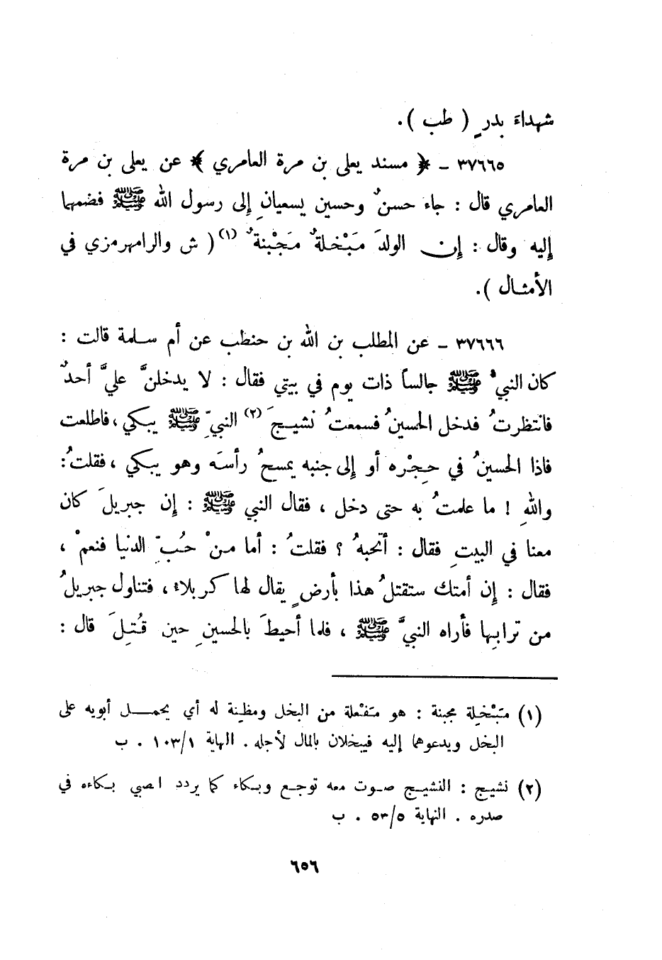 37669- عن المطلب بن عبد الله بن حنطب عن أم سلمة قالت: كان النبي صلى الله عليه وسلم جالسا ذات يوم في بيتي فقال: لا يدخلن علي أحد فانتظرت فدخل الحسين فسمعت نشيج2 النبي صلى الله عليه وسلم يبكي، فاطلعت فإذا الحسين في حجره أو إلى جنبه يمسح رأسه وهو يبكي، فقلت: والله! ما علمت به حتى دخل، فقال النبي صلى الله عليه وسلم: إن جبريل كان معنا في البيت فقال: أتحبه؟ فقلت: أما من حب الدنيا فنعم، فقال: إن أمتك ستقتل هذا بأرض يقال لها كربلاء، فتناول جبريل من ترابها فأراه النبي صلى الله عليه وسلم، فلما أحيط بالحسين حين قتل قال: