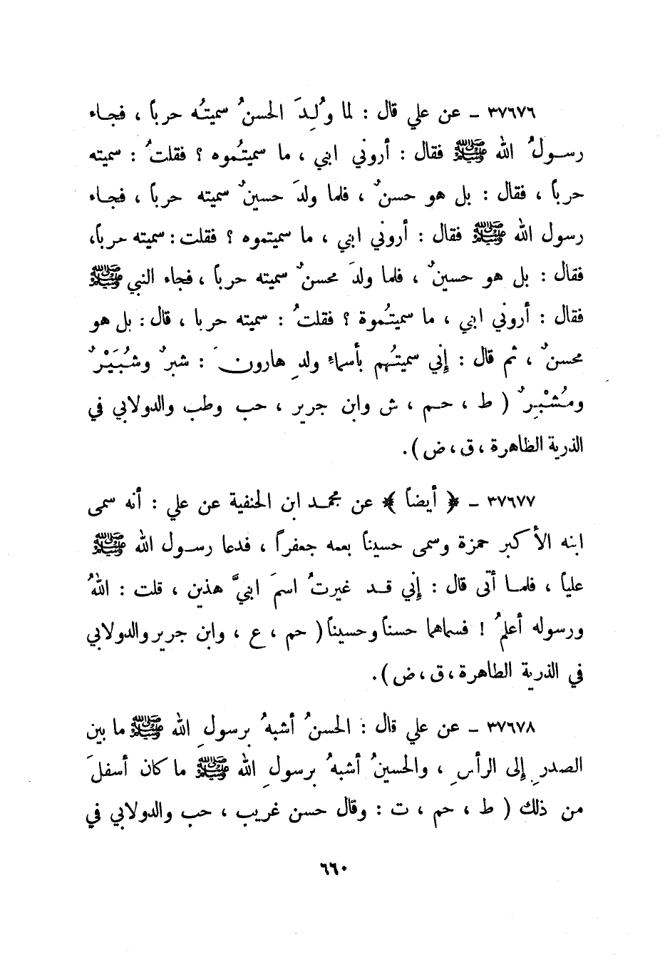 37679- عن علي قال: لما ولد الحسن سميته حربا، فجاء رسول الله صلى الله عليه وسلم فقال: أرو ني ابني، ماسميتموه؟ فقلت: سميته حربا، فقال: بل هو حسن، فلما ولد حسين سميته حربا، فجاء رسول الله صلى الله عليه وسلم فقال: أروني ابني، ما سميتموه؟ فقلت: سميته حربا، فقال: بل هو حسين، فلما ولد محسن سميته حربا، فجاء النبي صلى الله عليه وسلم فقال: أروني ابني، ما سميتموه؟ فقلت: سميته حربا، قال: بل هو محسن، ثم قال: إني سميتهم بأسماء ولد هارون: شبر وشبير ومشبر.