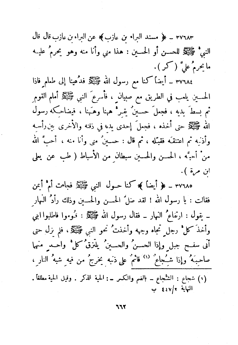 37688- "أيضا" كنا حول النبي صلى الله عليه وسلم فجاءت أم أيمن فقالت: يا رسول الله! لقد ضل الحسن والحسين وذلك رأد النهار - يقول: ارتفاع النهار - فقال رسول الله صلى الله عليه وسلم: قوموا فاطلبوا ابني وأخذ كل رجل تجاه وجهه وأخذت نحو النبي صلى الله عليه وسلم، فلم يزل حتى أتى سفح جبل وإذا الحسن والحسين يلتزق كل واحد منهما صاحبه وإذا شجاع1 قائم على ذنبه يخرج من فيه شبه النار،