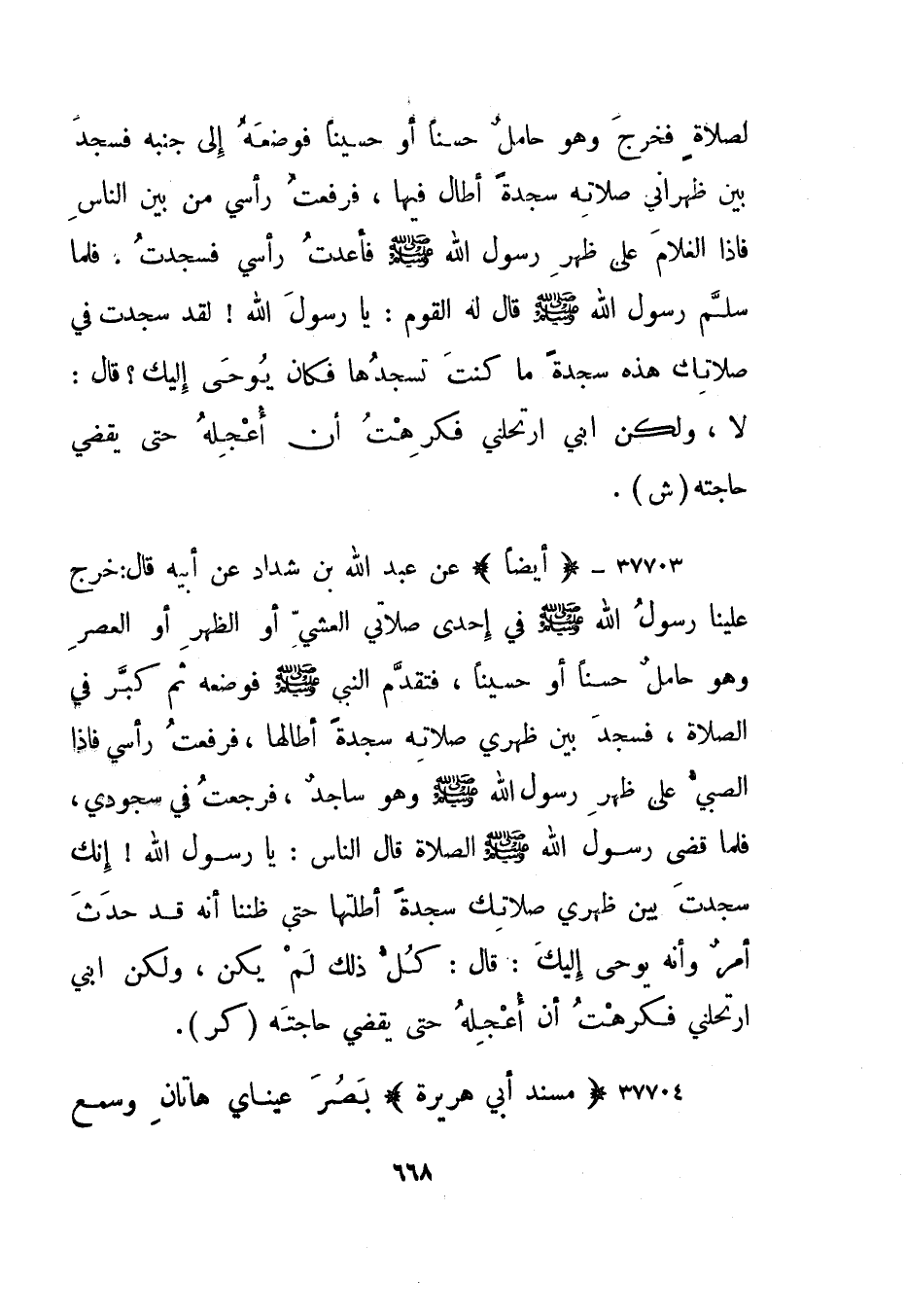 37706- "أيضا" عن عبد الله بن شداد عن أبيه قال: خرج علينا رسول الله صلى الله عليه وسلم في إحدى صلاتي العشي أو الظهر أو العصر وهو حامل حسنا أو حسينا، فتقدم النبي صلى الله عليه وسلم فوضعه ثم كبر في الصلاة، فسجد بين ظهري صلاته سجدة أطالها، فرفعت رأسي فإذا الصبي على ظهر رسول الله صلى الله عليه وسلم وهو ساجد، فرجعت في سجودي، فلما قضى رسول الله صلى الله عليه وسلم الصلاة قال الناس: يا رسول الله! إنك سجدت بين ظهري صلاتك سجدة أطلتها حتى ظننا أنه قد حدث أمر وأنه يوحى إليك: قال: كل ذلك لكم يكن، ولكن ابني ارتحلني فكرهت أن أعجله حتى يقضي حاجته. "كر".