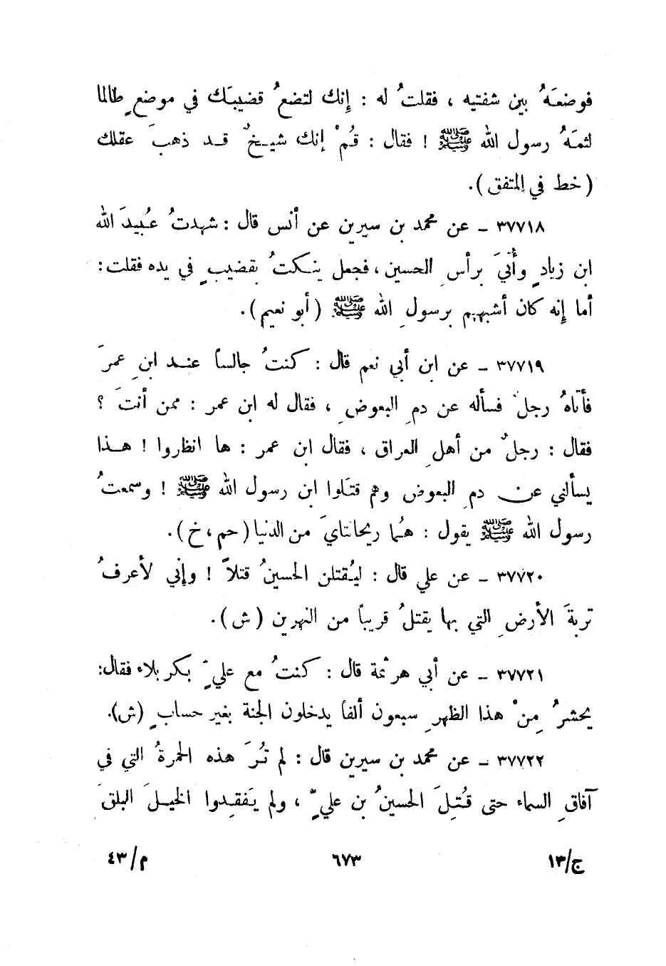 37721- عن محمد بن سيرين عن أنس قال: شهدت عبيد الله بن زياد وأتي برأس الحسين، فجعل ينكت بقضيب في يده فقلت: أما إنه كان أشبههم برسول الله صلى الله عليه وسلم."أبو نعيم".