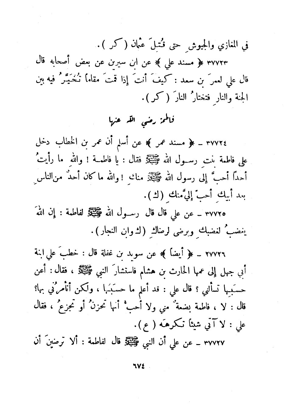 37727- "مسند عمر" عن أسلم أن عمر بن الخطاب دخل على فاطمة بنت رسول الله صلى الله عليه وسلم فقال: يا فاطمة والله ما رأيت أحدا أحب إلى رسول الله صلى الله عليه وسلم منك والله ما كان أحد من الناس بعد أبيك أحب إلي منك. "ك".