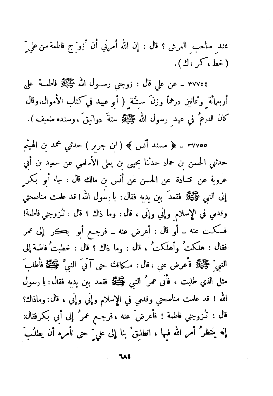 37757- عن علي قال: زوجني رسول الله صلى الله عليه وسلم فاطمة على أربعمائة وثمانين درهما وزن ستة.
