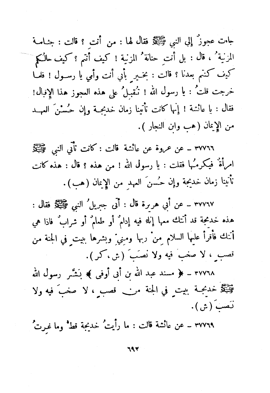 37769- عن عروة عن عائشة قالت: كانت تأتي النبي صلى الله عليه وسلم امرأة فيكرمها فقلت: يا رسول الله! من هذه؟ قال: هذه كانت تأتينا زمان خديجة وإن حسن العهد من الإيمان. "هب".