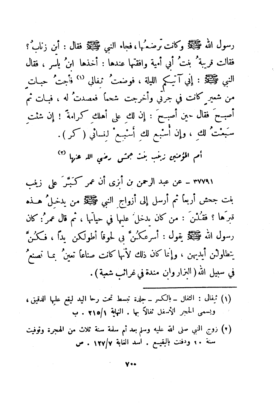 37794- عن عبد الرحمن بن أبزى أن عمر كبر على زينب بنت جحش أربعا ثم أرسل إلى أزواج النبي صلى الله عليه وسلم من يدخل هذه قبرها؟ فقلن: من كان يدخل عليها في حياتها، ثم قال عمر: كان رسول الله صلى الله عليه وسلم يقول: أسرعكن بي لحوقا أطولكن يدا، فكن يتطاولن أيديهن، وإنما كان ذلك لأنها كانت صناعا تعين بما تصنع في سبيل الله."البزار وابن منده في غرائب شعبة".