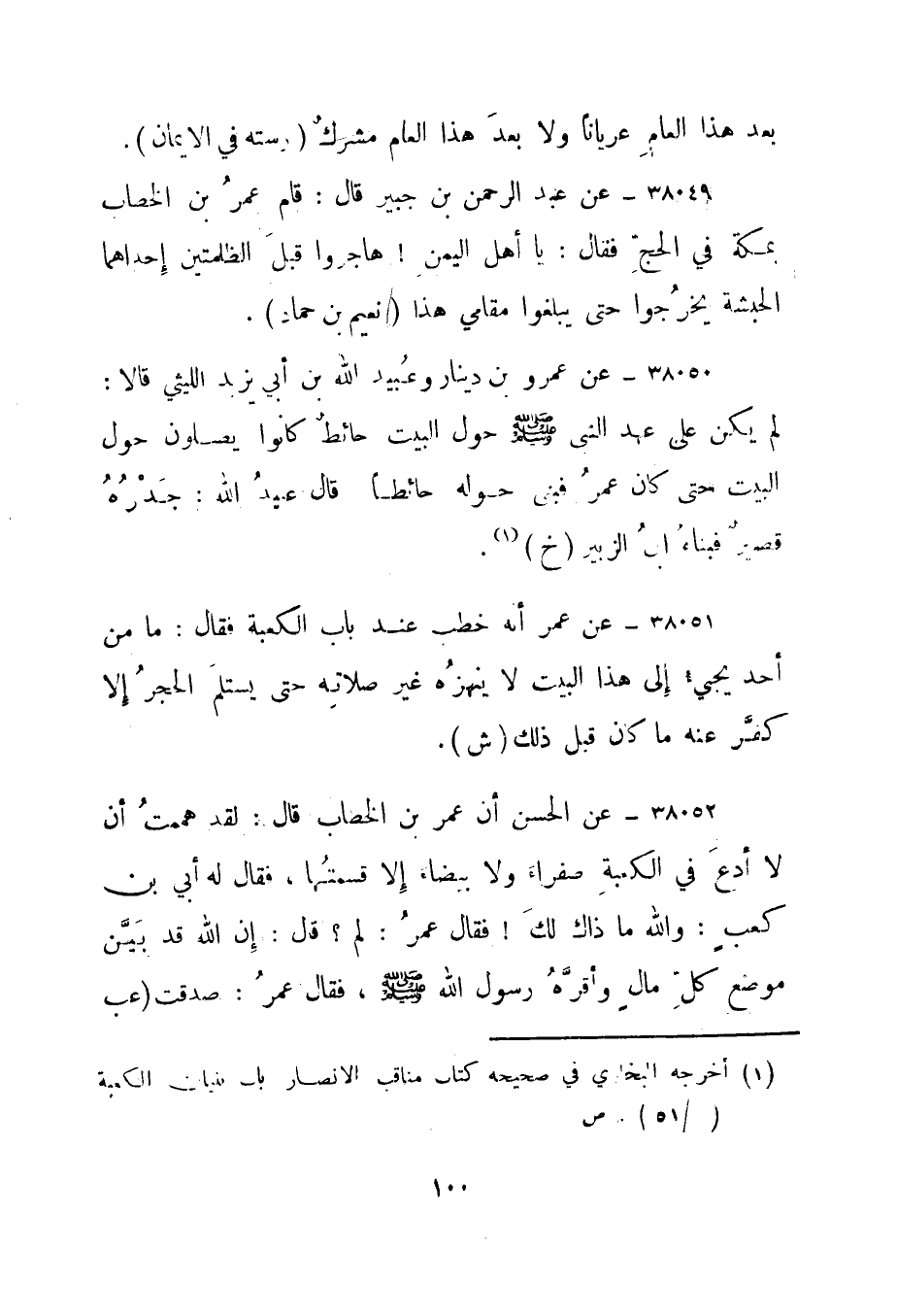 38050- عن عمرو بن دينار وعبيد الله بن أبي يزيد الليثي قالا: لم يكن على عهد النبي صلى الله عليه وسلم حول البيت حائط كانوا يصلون حول البيت حتى كان عمر فبنى حوله حائطا قال عبيد الله: جدره قصير فبناه ابن الزبير."خ"1