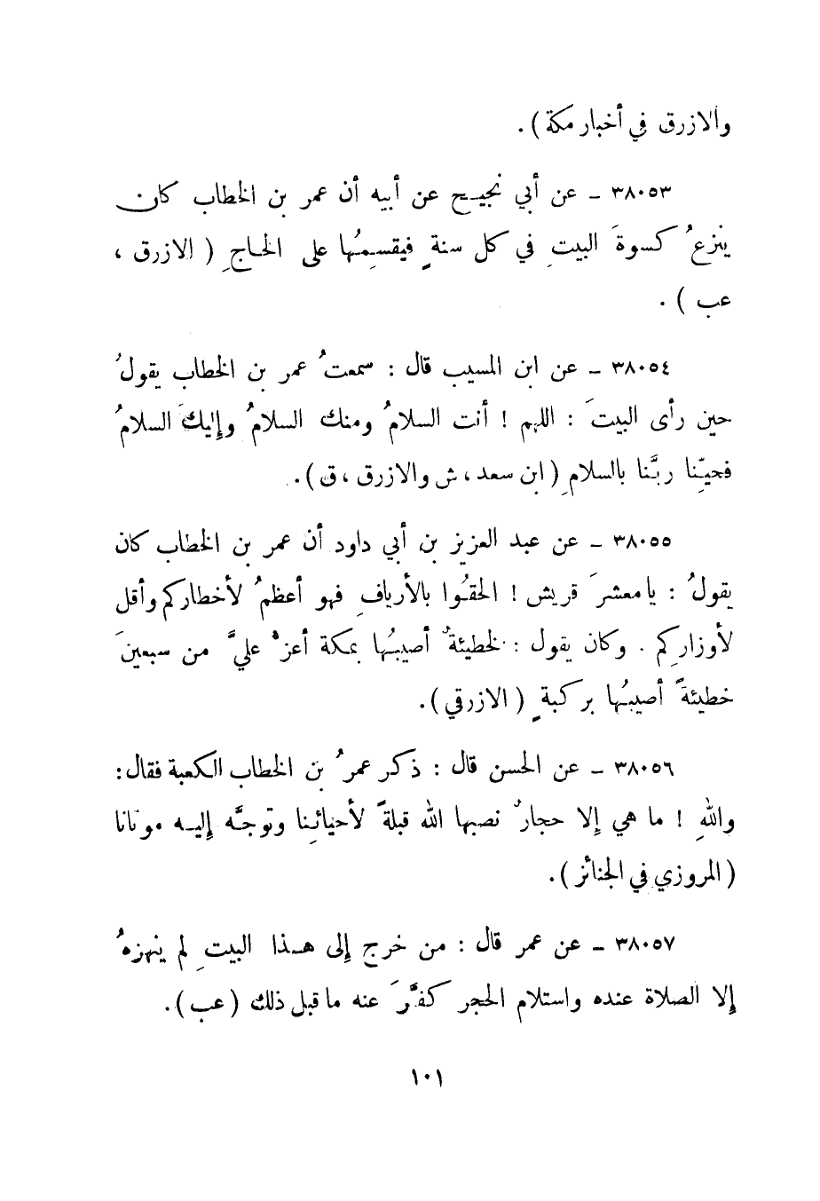 38053- عن أبي نجيح عن أبيه أن عمر بن الخطاب كان ينزع كسوة البيت في كل سنة فيقسمها على الحاج."الأزرق، عب".