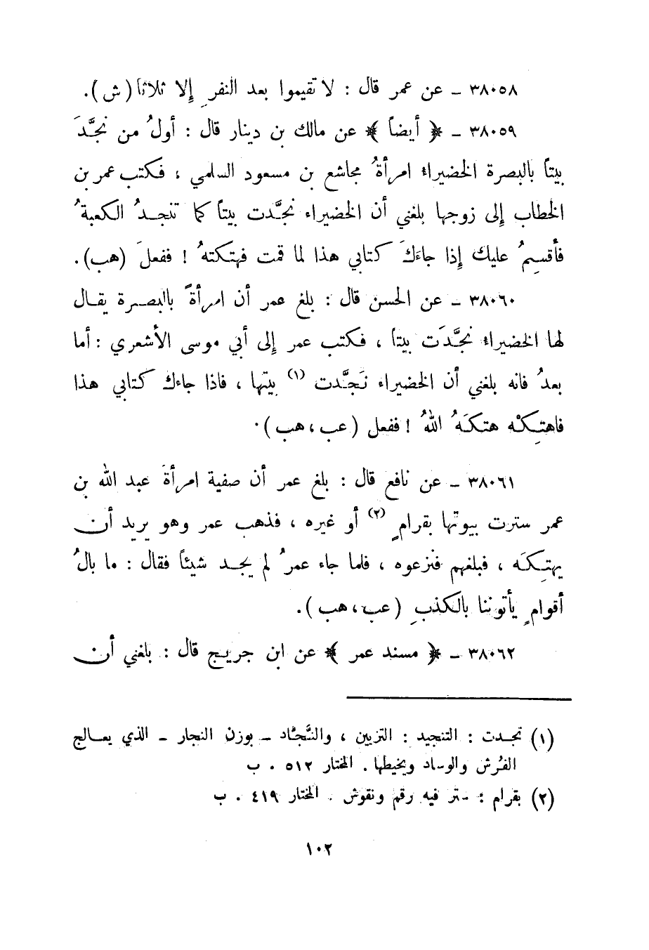 38060- عن الحسن قال: بلغ عمر أن امرأة بالبصرة يقال لها الخضيراء نجدت بيتا، فكتب عمر إلى أبي موسى الأشعري: أما بعد فإنه بلغني أن الخضيراء نجدت1 بيتها، فإذا جاءك كتابي هذا فاهتكه هتكه الله! ففعل."عب، هب".