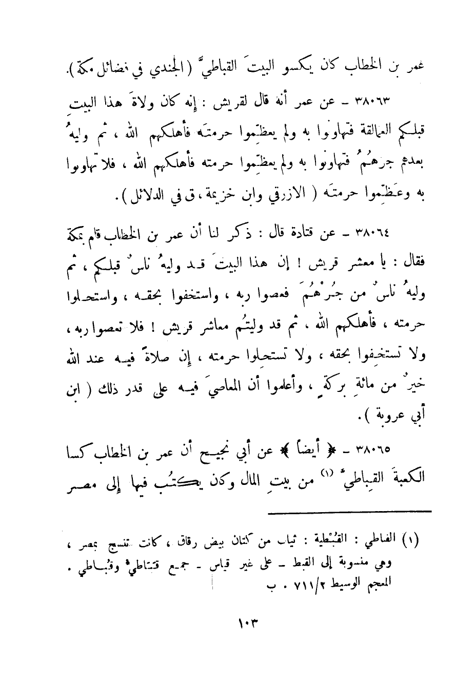 38065- "أيضا" عن أبي نجيح أن عمر بن الخطاب كسا الكعبة القباطي1 من بيت المال وكان يكتب فيها إلى مصر