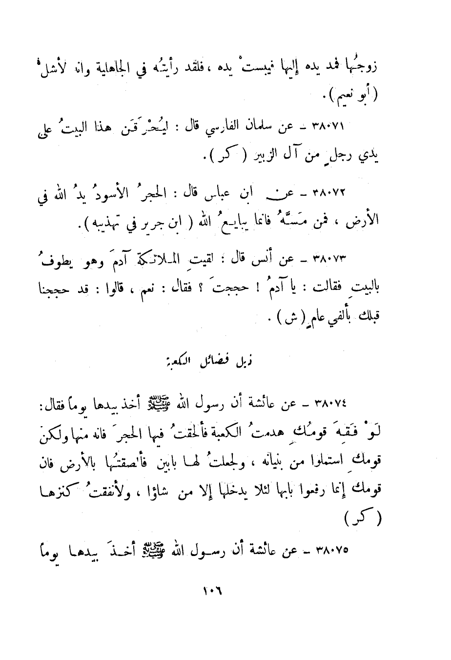 38074- عن عائشة أن رسول الله صلى الله عليه وسلم أخذ بيدها يوما فقال: "لو فقه قومك هدمت الكعبة فألحقت فيها الحجر فإنه منها ولكن قومك استملوا من بنيانه، ولجعلت لها بابين فألصقتها بالأرض فإن قومك إنما رفعوا بابها لئلا يدخلها إلا من شاؤا، ولأنفقت كنزها". "كر".