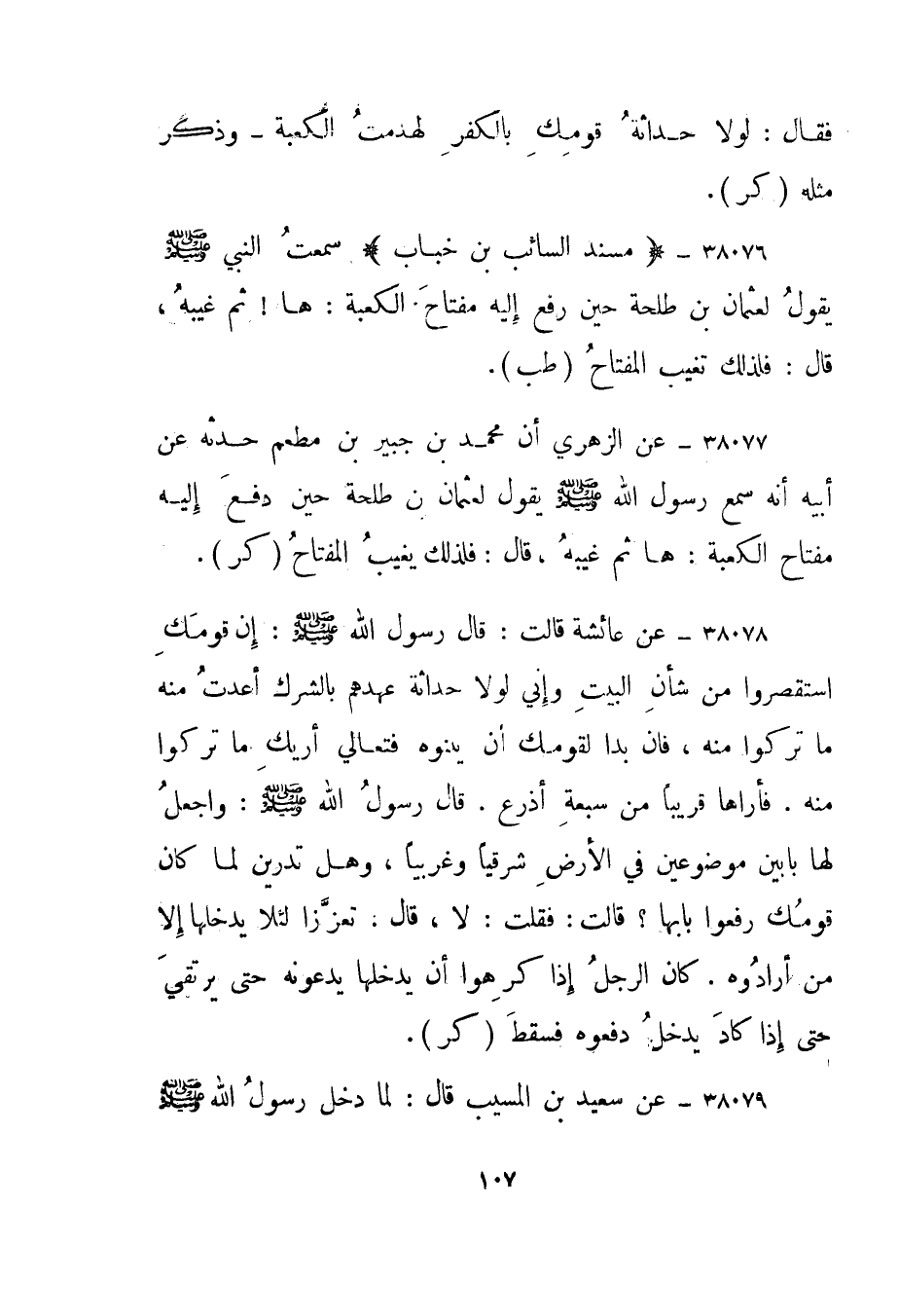 38078- عن عائشة قالت: قال رسول الله صلى الله عليه وسلم: "إن قومك استقصروا من شأن البيت وإني لولا حداثة عهدهم بالشرك أعدت منه ما تركوا منه، فإن بدا لقومك أن يبنوه فتعالي أريك ما تركوا منه". فأراها قريبا من سبعة أذرع. قال رسول الله صلى الله عليه وسلم: "واجعل لها بابين موضوعين في الأرض شرقيا وغربيا، وهل تدرين لما كان قومك رفعوا بابها؟ قالت: فقلت: لا، قال: تعززا لئلا يدخلها إلا من أرادوه. كان الرجل إذا كرهوا أن يدخلها يدعونه حتى يرتقي حتى إذا كاد يدخل دفعوه فسقط". "كر".
