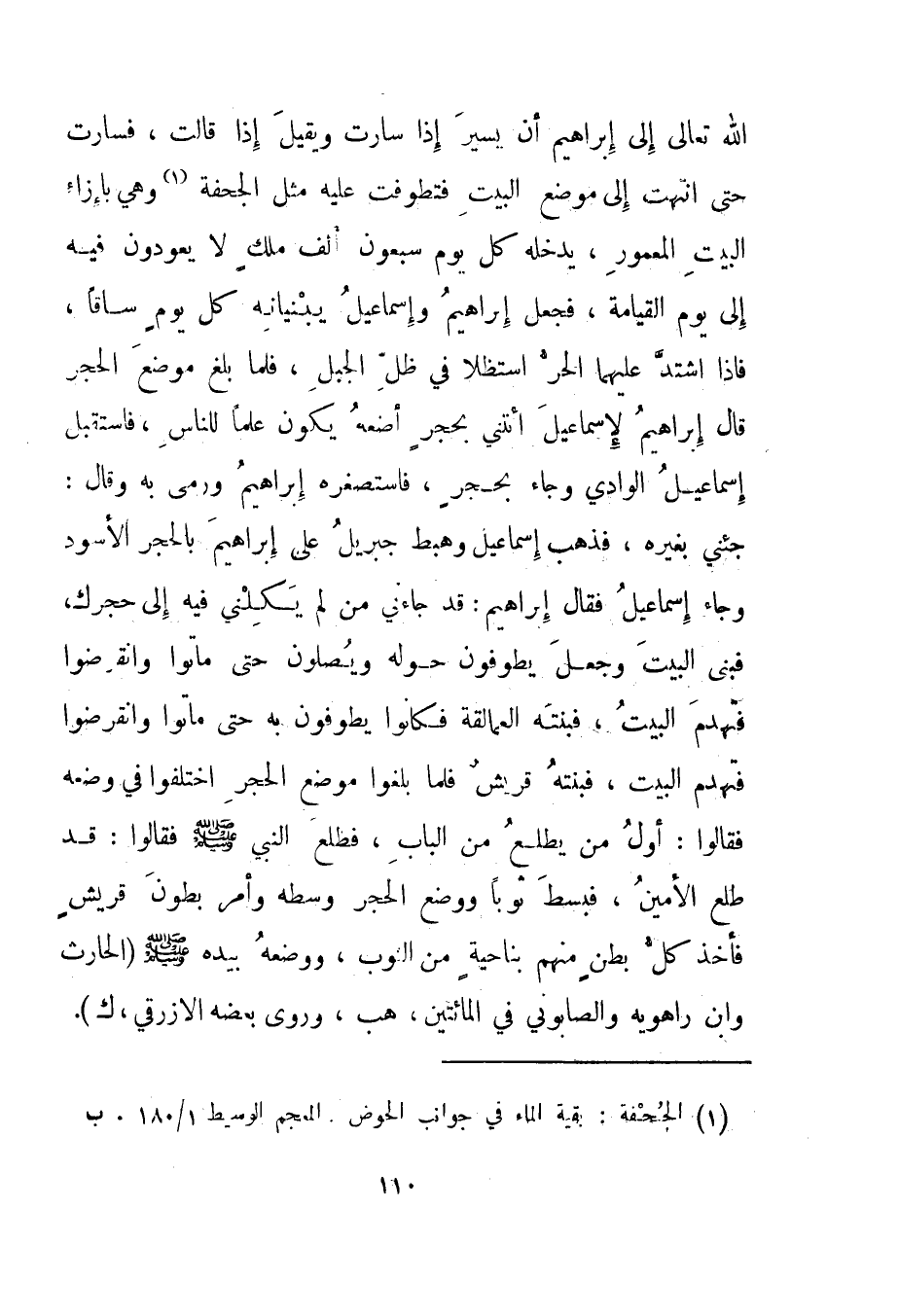 الله تعالى إلى إبراهيم أن يسير إذا سارت ويقيل إذا قالت، فسارت حتى انتهت إلى موضع البيت فتطوفت عليه مثل الجحفة1 وهي بإزاء البيت المعمور، يدخله كل يوم سبعون ألف ملك لا يعودون فيه إلى يوم القيامة، فجعل إبراهيم وإسماعيل يبنيانه كل يوم ساقا، فإذا اشتد عليهما الحر استظلا في ظل الجبل، فلما بلغ موضع الحجر قال إبراهيم لإسماعيل ائتني بحجر أضعه يكون علما للناس، فاستقبل إسماعيل الوادي وجاء بحجر، فاستصغره إبراهيم ورمى به وقال: جئني بغيره، فذهب إسماعيل وهبط جبريل على إبراهيم بالحجر الأسود وجاء إسماعيل فقال إبراهيم: قد جاءني من لم يكلني فيه إلى حجرك، فبنى البيت وجعل يطوفون حوله ويصلون حتى ماتوا وانقرضوا فتهدم البيت، فبنته العمالقة فكانوا يطوفون به حتى ماتوا وانقرضوا فتهدم البيت، فبنته قريش فلما بلغوا موضع الحجر اختلفوا في وضعه فقالوا: أول من يطلع من الباب، فطلع النبي صلى الله عليه وسلم فقالوا: قد طلع الأمين، فبسط ثوبا ووضع الحجر وسطه وأمر بطون قريش فأخذ كل بطن منهم بناحية من الثوب، ووضعه بيده صلى الله عليه وسلم. "الحارث وابن راهويه والصابوني في المائتين، هب، وروى بعضه الأزرقي، ك".