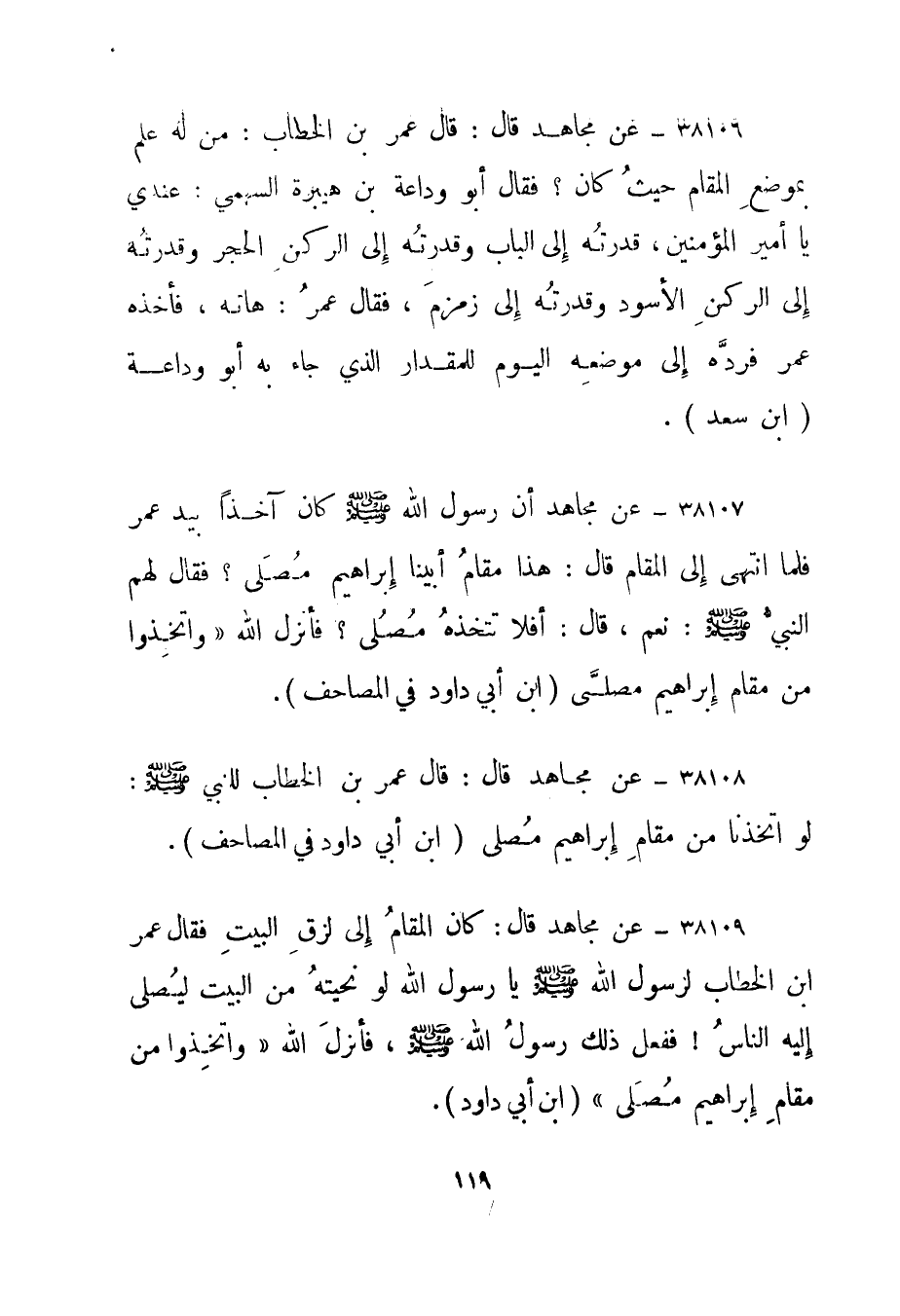 38106- عن مجاهد قال: قال عمر بن الخطاب: من له علم بموضع المقام حيث كان؟ فقال أبو وداعة بن هيبرة السهمي: عندي يا أمير المؤمنين، قدرته إلى الباب وقدرته إلى الركن الحجر وقدرته إلى الركن الأسود وقدرته إلى زمزم، فقال عمر: هاته، فأخذه عمر فرده إلى موضعه اليوم للمقدار الذي جاء به أبو وداعة."ابن سعد".