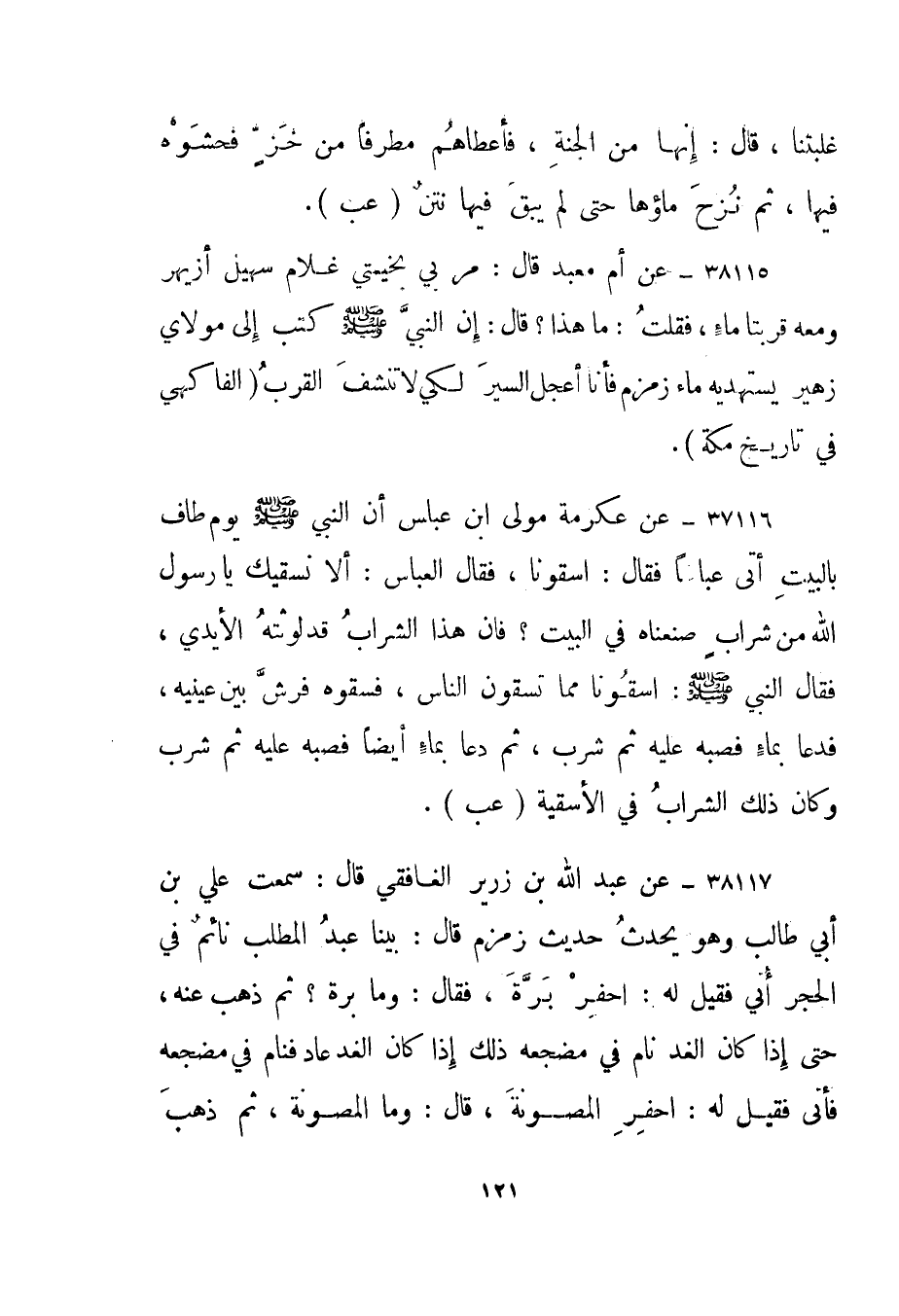 38117- عن عبد الله بن زرير الغافقي قال: سمعت علي بن أبي طالب وهو يحدث حديث زمزم قال: بينا عبد المطلب نائم في الحجر أتي فقيل له: احفر برة، فقال: وما برة؟ ثم ذهب عنه، حتى إذا كان الغد نام في مضجعه ذلك إذا كان الغد عاد فنام في مضجعه فأتى فقيل له: احفر المصونة، قال: وما المصونة، ثم ذهب