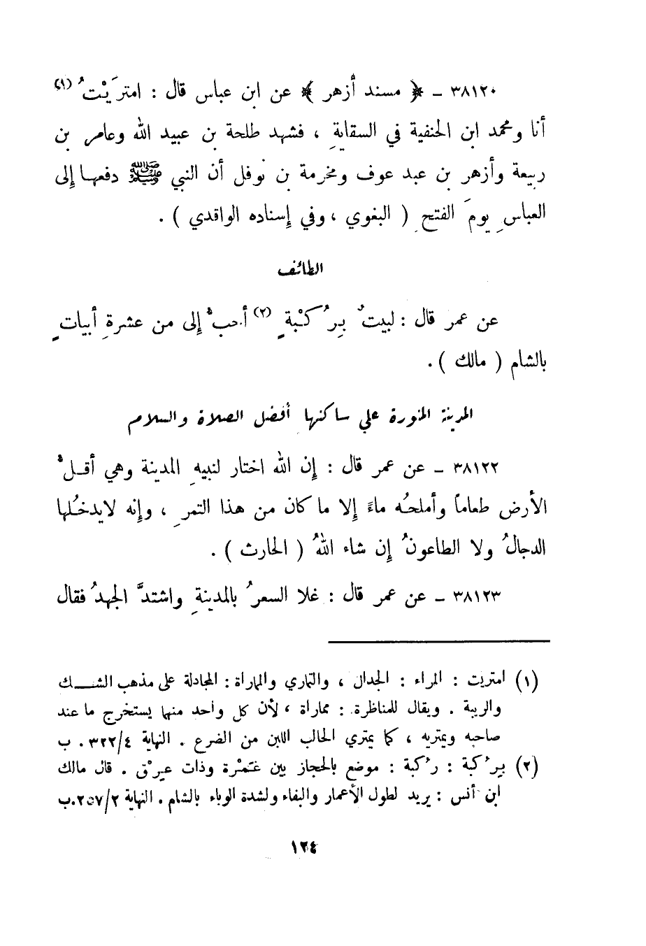 38121- عن عمر قال: لبيت بركبة1 أحب إلي من عشرة أبيات بالشام."مالك".