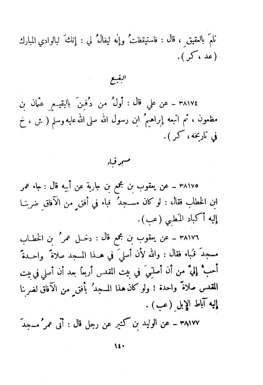 38176- عن يعقوب بن مجمع قال: دخل عمر بن الخطاب مسجد قباء فقال: والله لأن أصلي في هذا المسجد صلاة واحدة أحب إلي من أن أصلي في بيت المقدس أربعا بعد أن أصلي في بيت المقدس صلاة واحدة! ولو كان هذا المسجد بأفق من الآفاق لضربنا إليه آباط الإبل."عب".