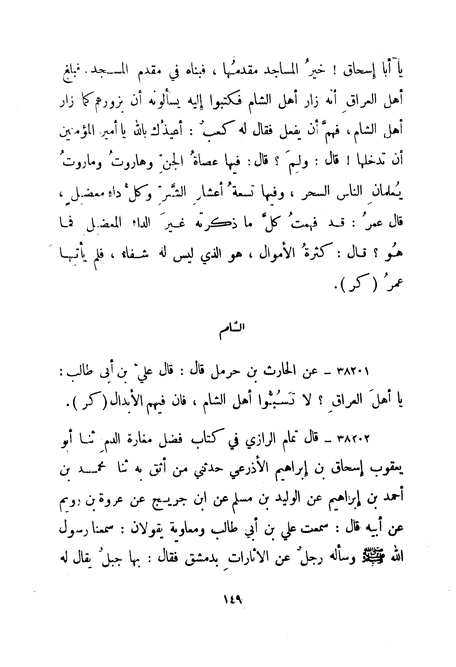 38201- عن الحارث بن حرمل قال: قال علي بن أبي طالب: يا أهل العراق؟ لا تسبوا أهل الشام، فإن فيهم الأبدال."كر".