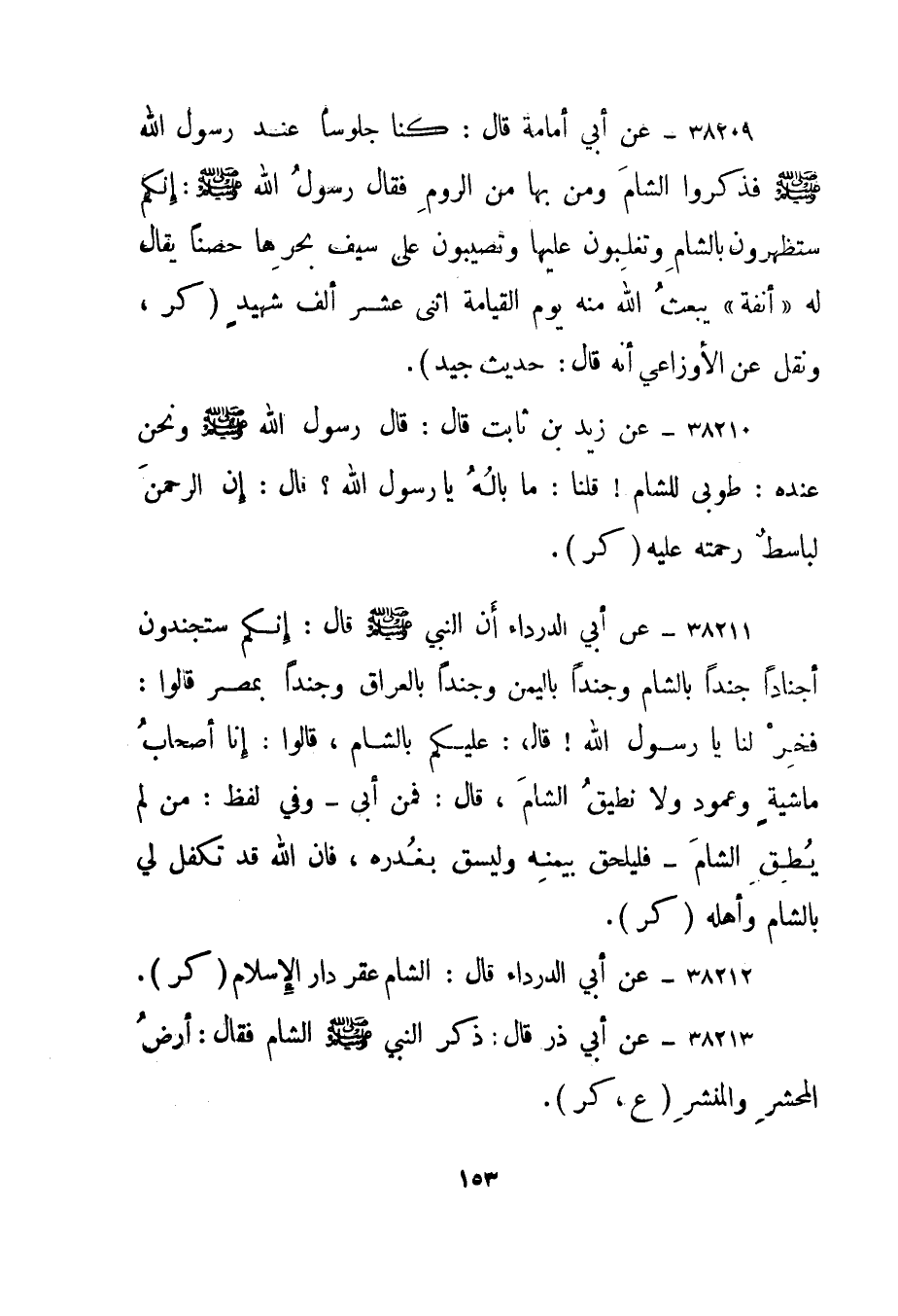 38211- عن أبي الدرداء أن النبي صلى الله عليه وسلم قال: "إنكم ستجندون أجنادا جندا بالشام وجندا باليمن وجندا بالعراق وجندا بمصر" قالوا: فخر لنا يا رسول الله! قال: "عليكم بالشام" قالوا: إنا أصحاب ماشية وعمود ولا نطيق الشام، قال: فمن أبى - وفي لفظ: "من لم يطق الشام - فليلحق بيمنه وليسق بغدره، فإن الله قد تكفل لي بالشام وأهله". "كر".