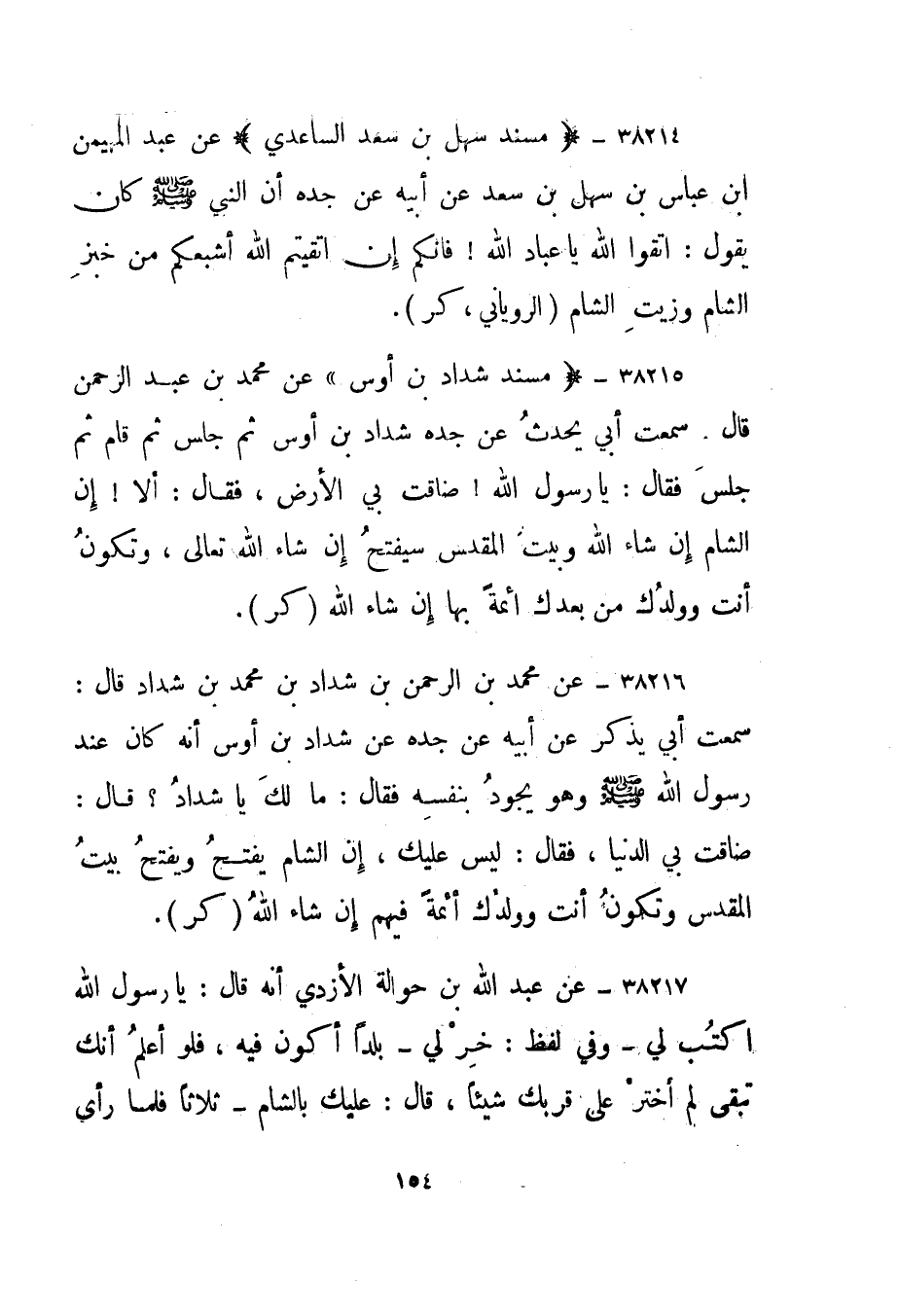 38215- "مسند شداد بن أوس" عن محمد بن عبد الرحمن قال: سمعت أبي يحدث عن جده شداد بن أوس ثم جلس ثم قام ثم جلس فقال: يا رسول الله! ضاقت بي الأرض، فقال: "ألا! إن الشام إن شاء الله وبيت المقدس سيفتح إن شاء الله تعالى، وتكون أنت وولدك من بعدك أئمة بها إن شاء الله." كر".