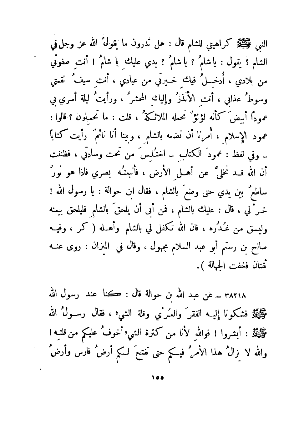 38218- عن عبد الله بن حوالة قال: كنا عند رسول الله صلى الله عليه وسلم فشكونا إليه الفقر والعري وقلة الشيء، فقال رسول الله صلى الله عليه وسلم: "أبشروا! فوالله لأنا من كثرة الشيء أخوف عليكم من قلته! والله لا يزال هذا الأمر فيكم حتى تفتح لكم أرض فارس وأرض