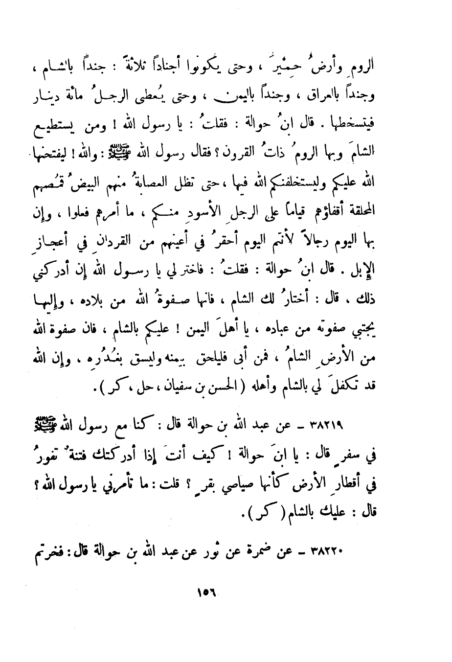 38219- عن عبد الله بن حوالة قال: كنا مع رسول الله صلى الله عليه وسلم في سفر قال: "يا ابن حوالة! كيف أنت إذا أدركتك فتنة تفور في أقطار الأرض كأنها صياصي بقر؟ قلت: ما تأمرني يا رسول الله؟ قال: عليك بالشام." كر".