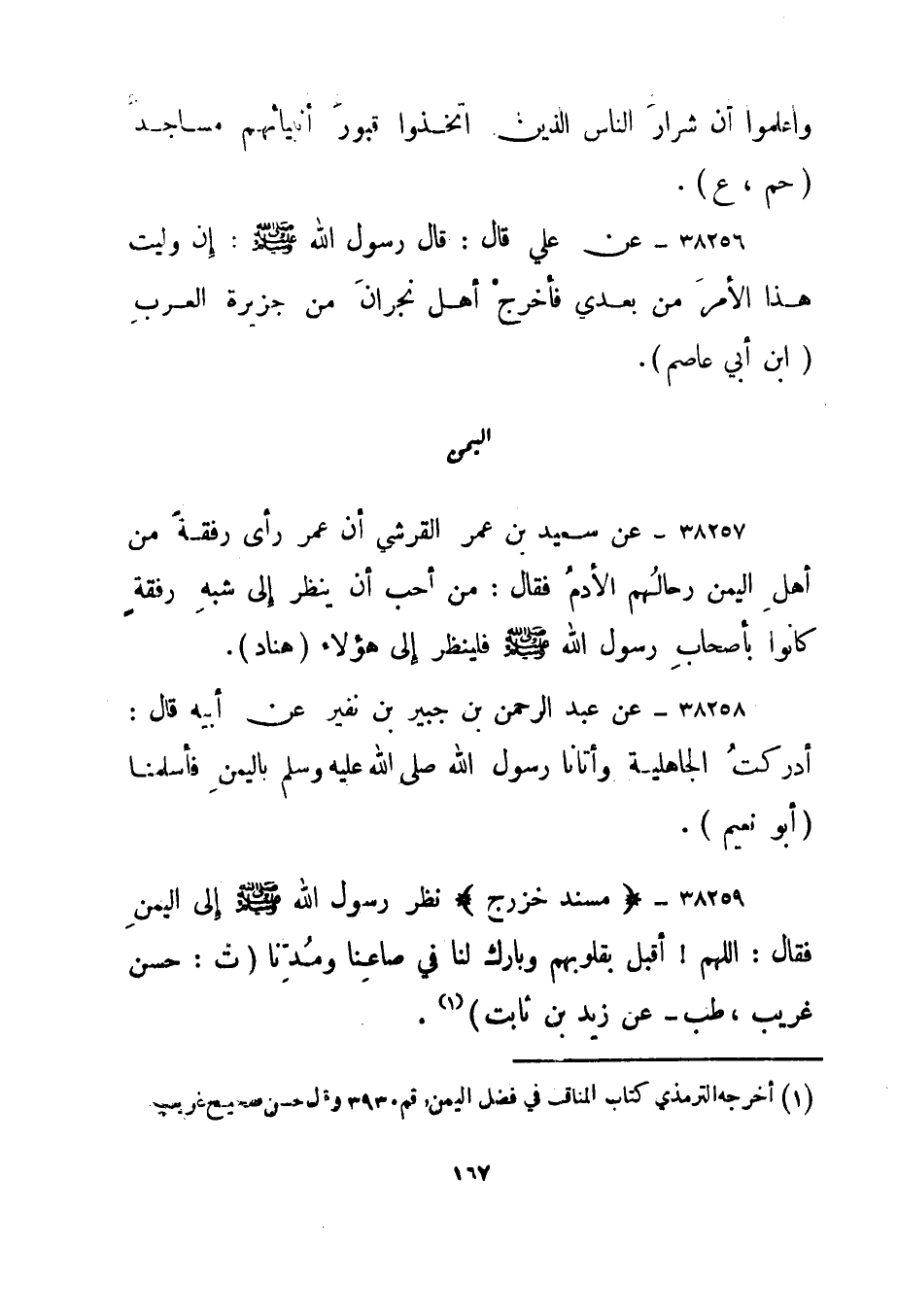 38259- "مسند خزرج" نظر رسول الله صلى الله عليه وسلم إلى اليمن فقال: اللهم! أقبل بقلوبهم وبارك لنا في صاعنا ومدنا." ت: حسن غريب، طب - عن زيد بن ثابت"1