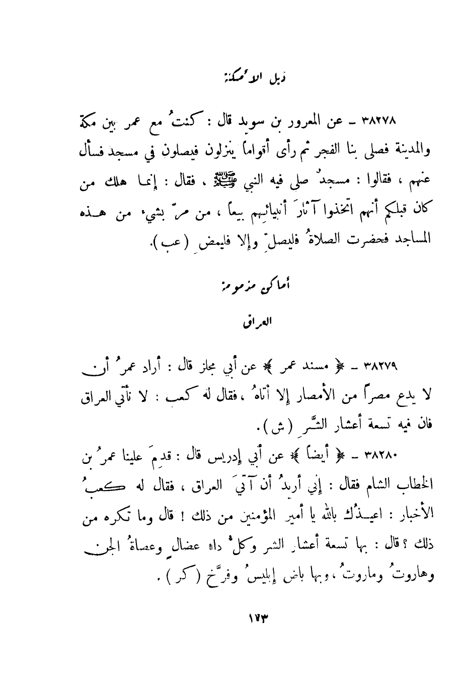 38278- عن المعرور بن سويد قال: كنت مع عمر بين مكة والمدينة فصلى بنا الفجر ثم رأى أقواما ينزلون فيصلون في مسجد فسأل عنهم، فقالوا: مسجد صلى فيه النبي صلى الله عليه وسلم، فقال: إنما هلك من كان قبلكم أنهم اتخذوا آثار أنبيائهم بيعا، من مر بشيء من هذه المساجد فحضرت الصلاة فليصل وإلا فليمض."عب".