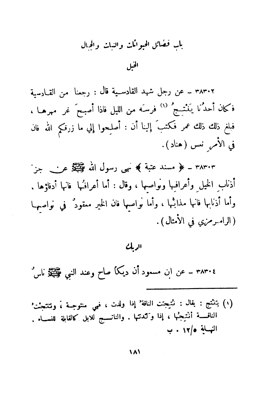 38303- "مسند عتبة " نهى رسول الله صلى الله عليه وسلم عن جزء أذناب الخيل وأعرافها ونواصيها، وقال: أما أعرافها فإنها أدفاؤها، وأما أذنابها فإنها مذابها، وأما نواصيها فإن الخير معقود في نواصيها." الرامهرمزي في الأمثال".