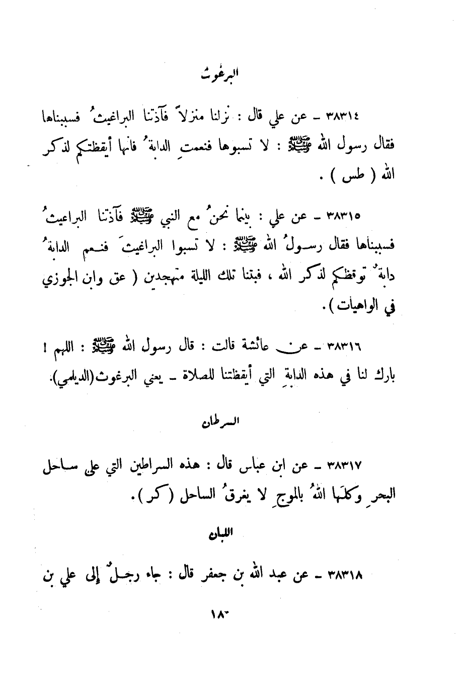 38314- عن علي قال: نزلنا منزلا فآذتنا البراغيث فسببناها فقال رسول الله صلى الله عليه وسلم: "لا تسبوها فنعمت الدابة فإنها أيقظتكم لذكر الله"."طس".