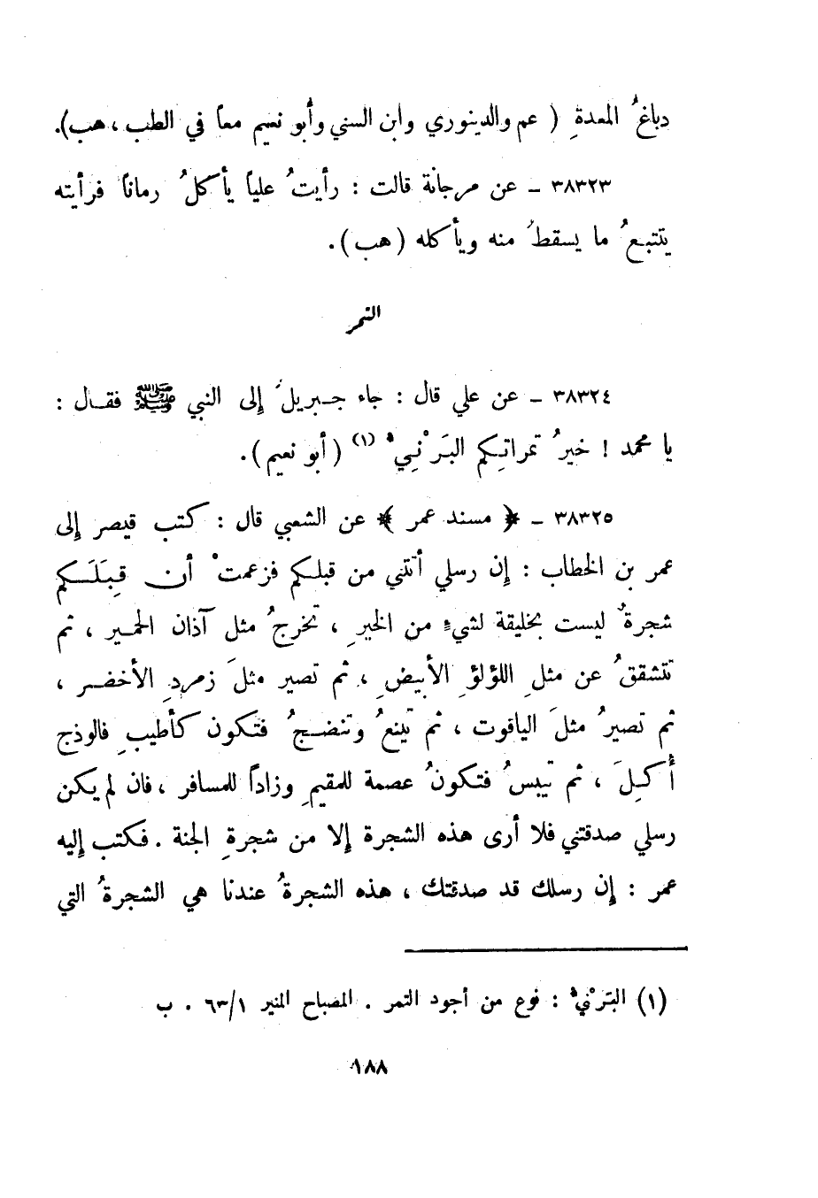 38325- "مسند عمر" عن الشعبي قال: كتب قيصر إلى عمر بن الخطاب: إن رسلي أتتني من قبلكم فزعمت أن قبلكم شجرة ليست بخليقة لشيء من الخير، تخرج مثل آذان الحمير، ثم تتشقق عن مثل اللؤلؤ الأبيض، ثم تصير مثل زمرد الأخضر، ثم تصير مثل الياقوت، ثم تينع وتنضج فتكون كأطيب فالوذج أكل، ثم تيبس فتكون عصمة للمقيم وزادا للمسافر، فإن لم يكن رسلي صدقتني فلا أرى هذه الشجرة إلا من شجرة الجنة. فكتب إليه عمر: إن رسلك قد صدقتك، هذه الشجرة عندنا هي الشجرة التي