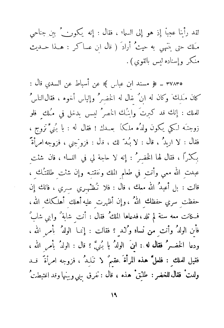 37835- "مسند ابن عباس" عن أسباط عن السدي قال: كان ملك وكان له ابن يقال له الخضر وإلياس أخوه، فقال الناس للملك: إنك قد كبرت وابنك الخضر ليس يدخل في ملك فلو زوجته لكي يكون ولده ملكا بعدك! فقال له: يا بني تزوج، فقال: لا أريد، قال: لا بد لك، قال: فزوجني، فزوجه امرأة بكرا، فقال لها الخضر: إنه لا حاجة لي في النساء، فإن شئت عبدت الله معي وأنت في طعام الملك ونفقته وإن شئت طلقتك، قالت: بل أعبد الله معك، قال: فلا تظهري سري، فإنك إن حفظت سري حفظك الله، وإن أظهرت عليه أهلك أهلكك الله. فكانت معه سنة لم تلد، فدعاها الملك فقال: أنت شابة وابني شاب فأين الولد وأنت من نساء ولد؟ فقالت: إنما الولد بأمر الله، ودعا الخضر فقال له: أين الولد يا بني؟ قال: الولد بأمر الله، فقيل للملك: فلعل هذه المرأة عقيم لا تلد، فزوجه امرأة قد ولدت فقال للخضر: طلق هذه، قال: تفرق بيني وبينها وقد اغتبطت