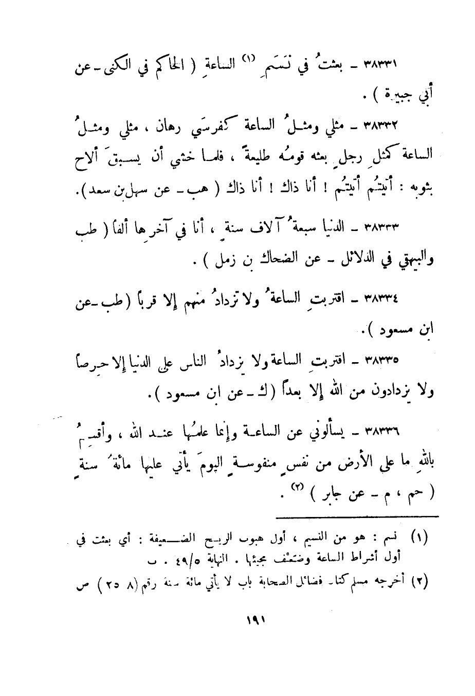 38336- "يسألوني عن الساعة وإنما علمها عند الله، وأقسم بالله ما على الأرض من نفس منفوسة اليوم يأتي عليها مائة سنة". حم، م - عن جابر"2