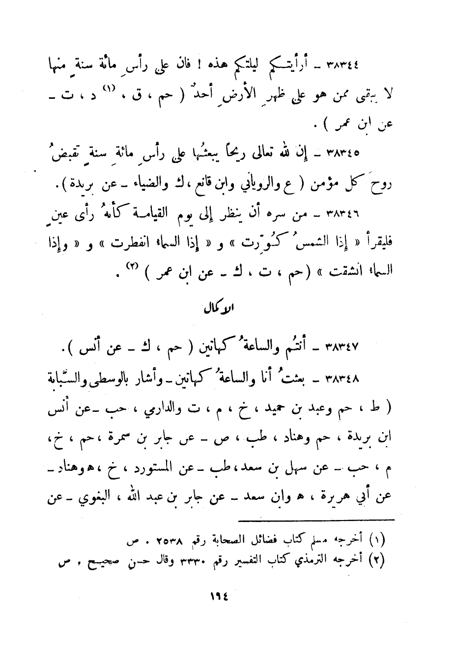 38344- "أرأيتكم ليلتكم هذه! فإن على رأس مائة سنة منها لا يبقى ممن هو على ظهر الأرض أحد". حم، ق،1 د، ت - عن ابن عمر".