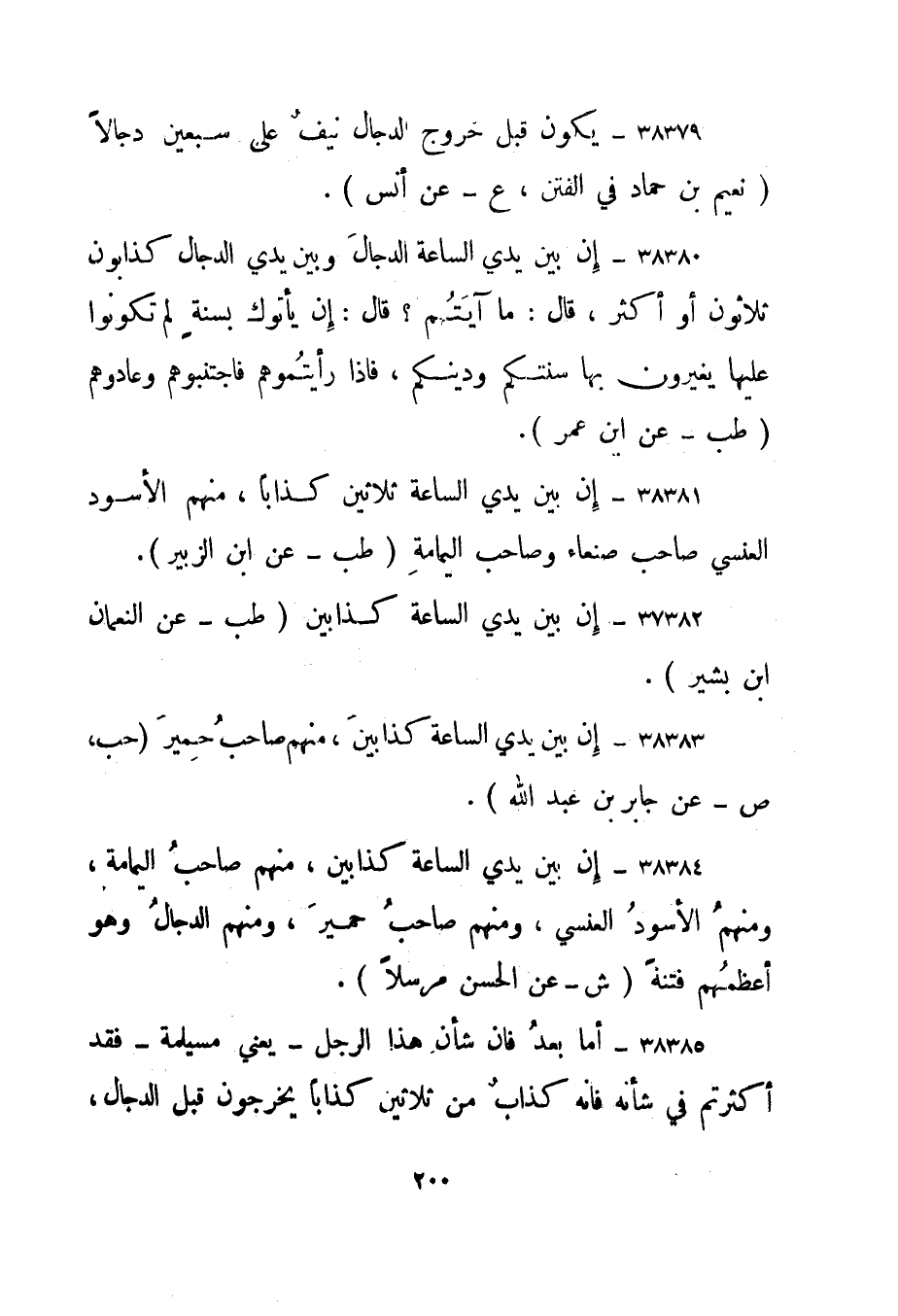 38379- "يكون قبل خروج الدجال نيف على سبعين دجالا." نعيم بن حماد في الفتن، ع - عن أنس".
