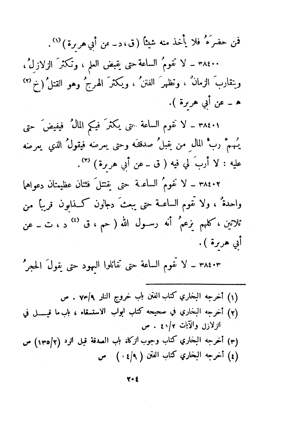 38400- "لا تقوم الساعة حتى يقبض العلم، وتكثر الزلازل، ويتقارب الزمان، وتظهر الفتن، ويكثر الهرج وهو القتل." خ2 هـ - عن أبي هريرة".