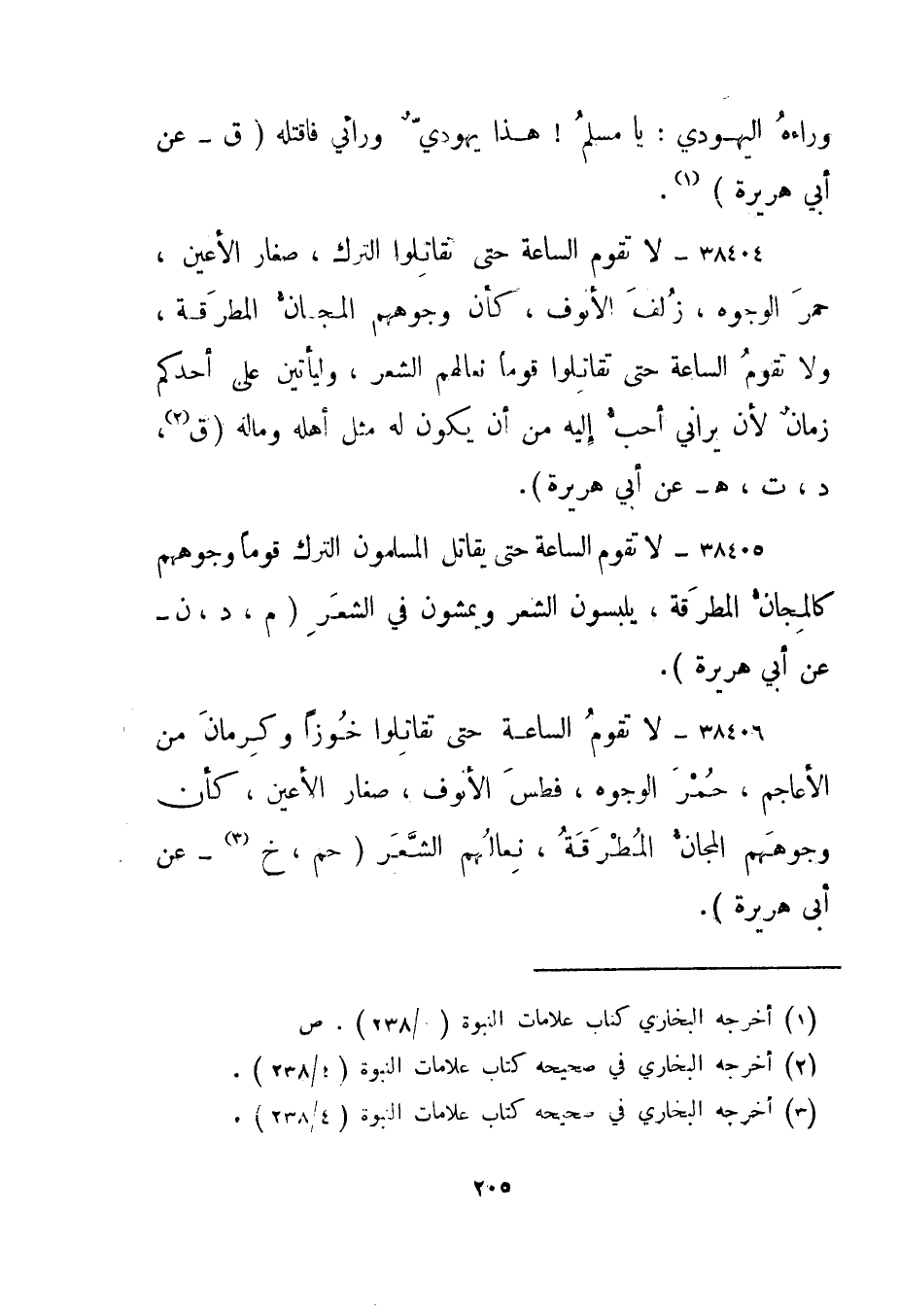 38405- "لا تقوم الساعة حتى يقاتل المسلمون الترك قوما وجوههم كالمجان المطرقة، يلبسون الشعر ويمشون في الشعر." م، د، ن - عن أبي هريرة".