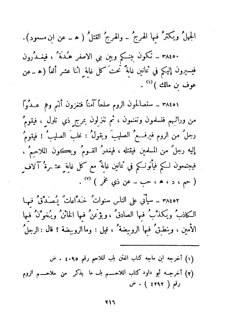 38451- "ستصالحون الروم صلحا آمنا فتغزون أنتم وهم عدوا من ورائهم فتسلمون وتغنمون، ثم تنزلون بمرج ذي تلول، فيقوم رجل من الروم فيرفع الصليب ويقول: غلب الصليب! فيقوم إليه رجل من المسلمين فيقتله، فيغدر القوم ويكون الملاحم، فيجتمعون لكم فيأتونكم في ثمانين غاية مع كل غاية عشرة آلاف." حم، د، هـ، حب - عن ذي مخمر"2