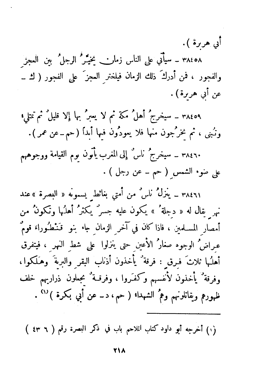 38461- "ينزل ناس من أمتي بغائط يسمونه "البصرة" عند نهر يقال له "دجلة" يكون عليه جسر يكثر أهلها وتكون من أمصار المسلمين، فإذا كان في آخر الزمان جاء بنو قنطوراء قوم عراض الوجوه صغار الأعين حتى ينزلوا على شط النهر، فيتفرق أهلها ثلاث فرق: فرقة يأخذون أذناب البقر والبرية وهلكوا، وفرقة يأخذون لأنفسهم وكفروا، وفرقة يجعلون ذراريهم خلف ظهورهم ويقاتلونهم وهم الشهداء." حم، د - عن أبي بكرة"1